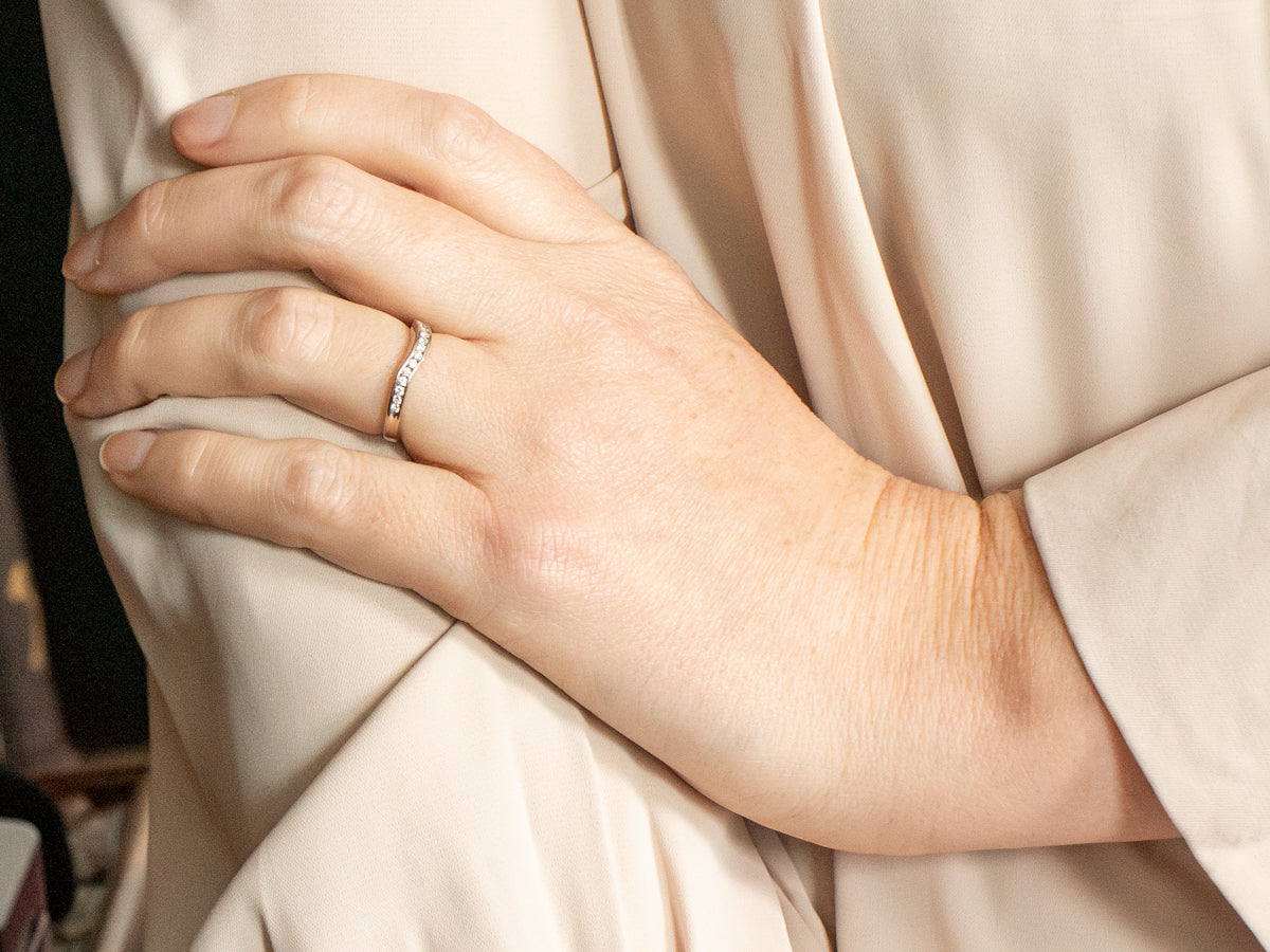 Indulge in the sophistication of this band, featuring sparkling diamonds set in a unique curved design. Perfect for protecting and accentuating your treasured engagement ring, this beautiful piece adds a touch of elegance to any ensemble!