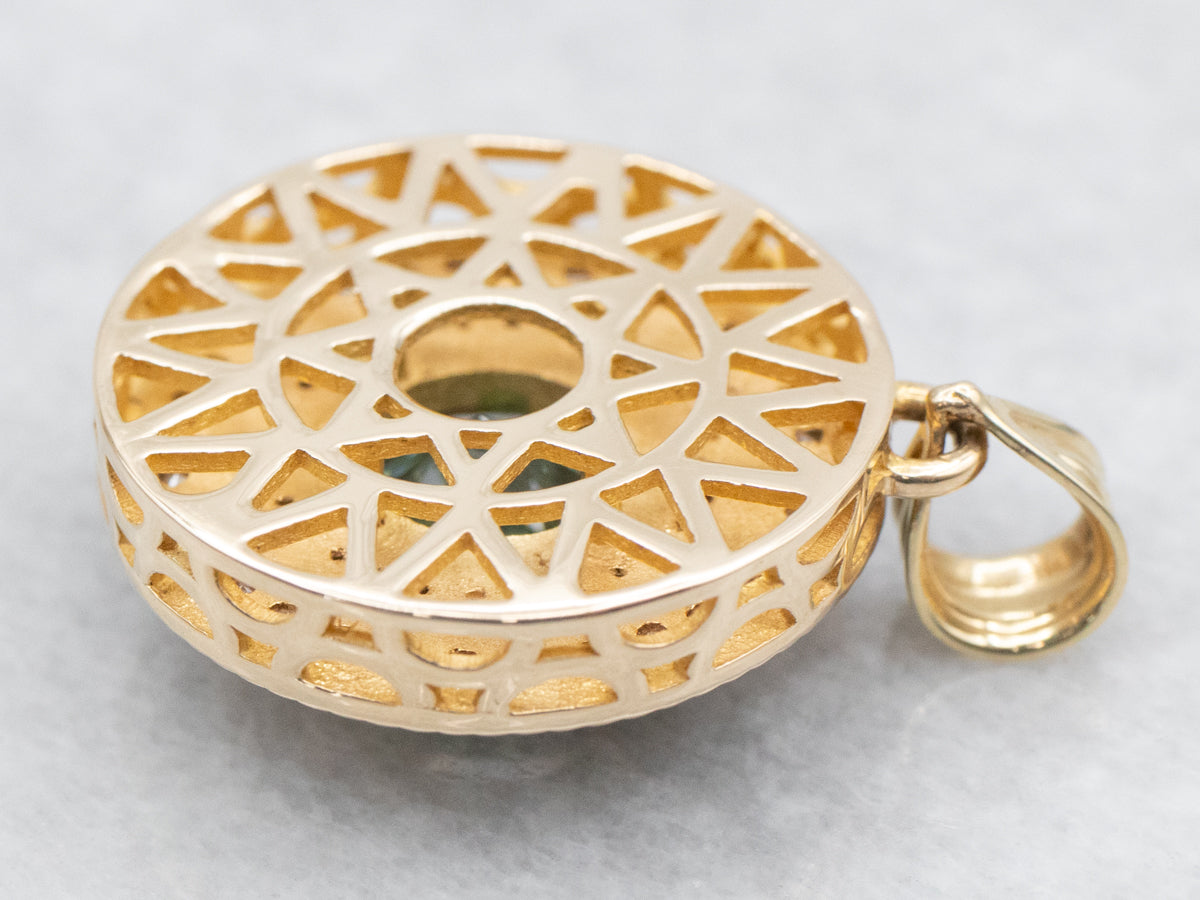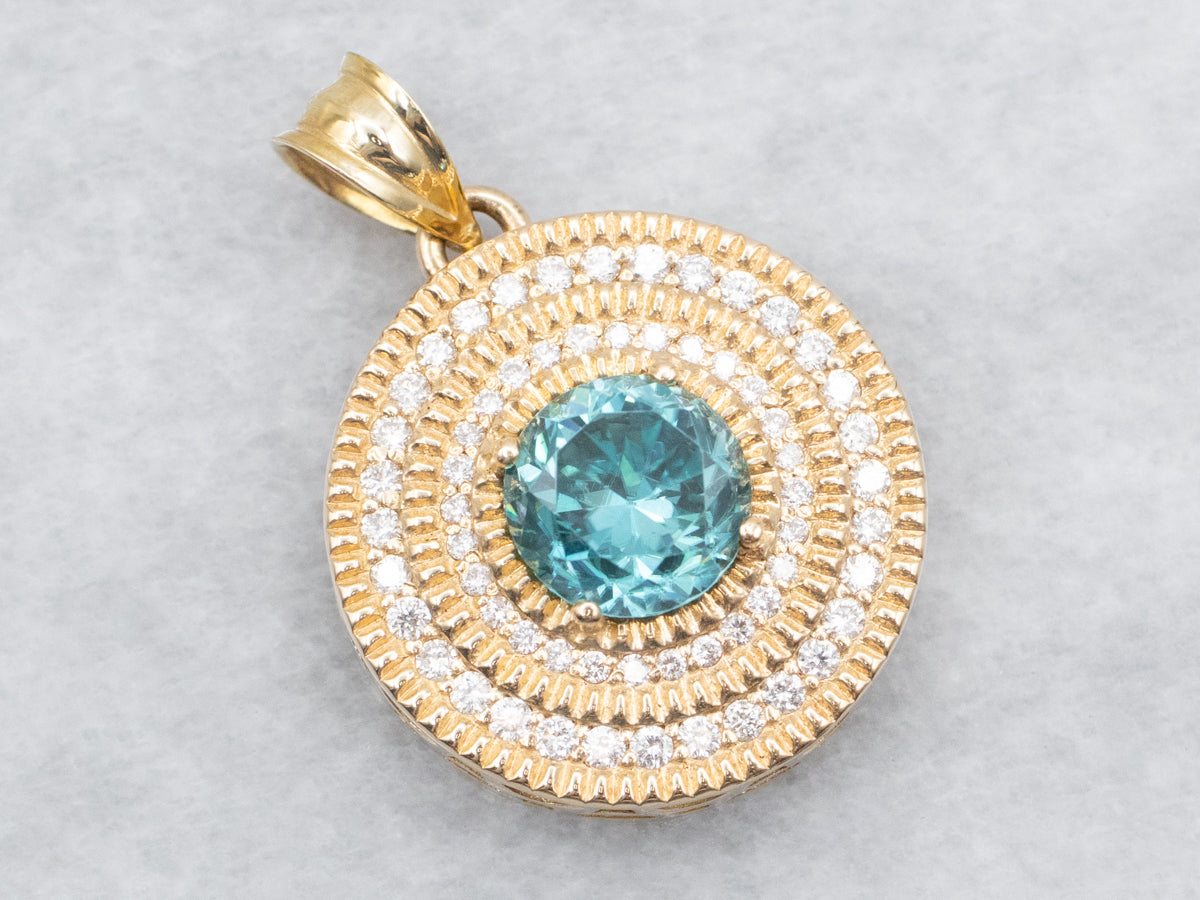 This classic pendant is the perfect piece to add a touch of sophistication to your day-to-day look. Crafted of both yellow and white gold, and set with a stunning blue zircon surrounded by mixed-cut diamonds. Truly a stunning combination of color and sparkle.