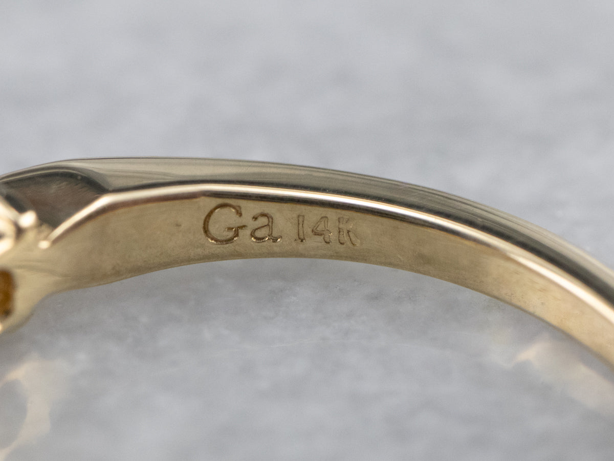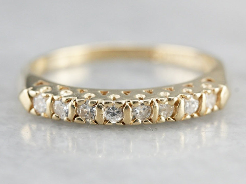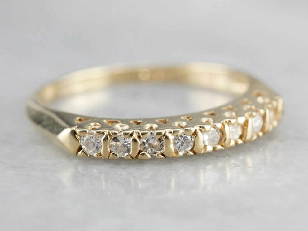 Esta alianza presenta una hilera de diamantes brillantes y resplandecientes, cada uno de ellos engastado en engastes protectores de cuatro puntas. Elaborado en oro amarillo de 14 quilates, este anillo tiene un diseño clásico que será atemporal en los años venideros.