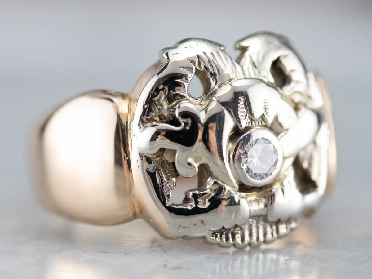 Un símbolo antiguo de los Shriners con incrustaciones de brillantes rubíes sintéticos y un solo diamante brillante, este tachuela de corbata vintage está confeccionada en oro blanco pulido de 18 quilates con hermosos detalles milgrain. ¡Esta pieza sería un regalo fantástico para el Shriner en su vida!