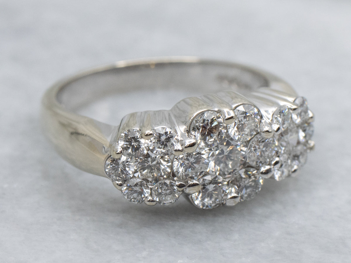 This white gold diamond cluster ring showcases expertly selected round-brilliant diamonds arranged in a contemporary design that maximizes light performance. The clustering technique creates sophisticated visual depth while the white gold setting provides a refined backdrop for the stones' natural brilliance. A refined choice for discerning collectors who appreciate both modern aesthetics and gemological quality.