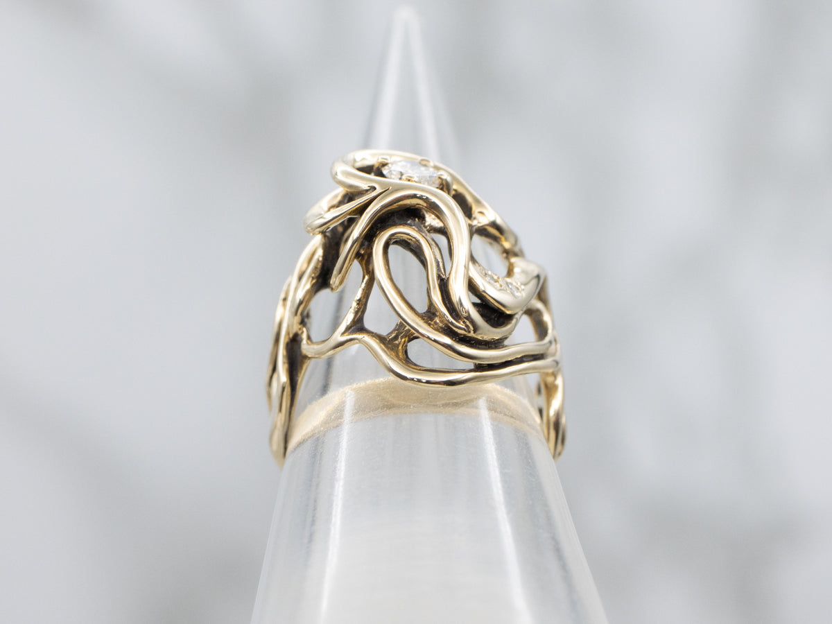 A striking vintage piece that merges geometric abstraction with timeless luxury. This statement ring features carefully selected diamonds set within a modernist gold framework, creating bold visual interest through its sculptural design. Perfect for those who appreciate avant-garde aesthetics and exceptional craftsmanship. An investment piece that transcends trends while commanding attention on any hand.