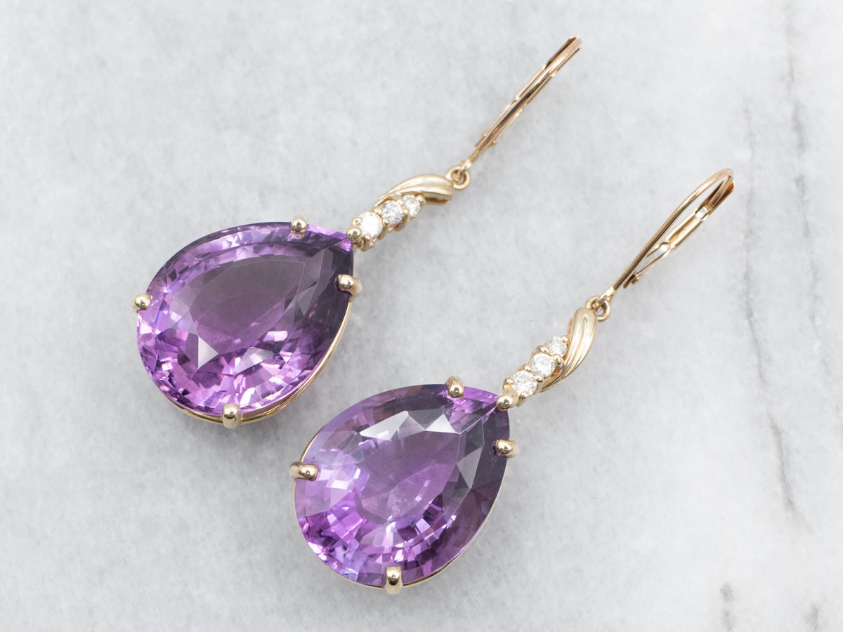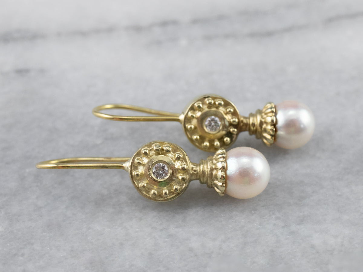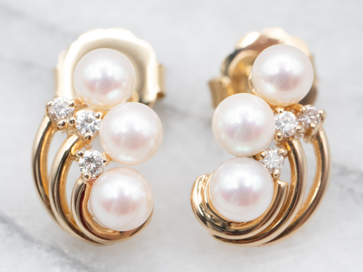 These vintage earrings are in excellent condition. Large pearls, with their bright white color and soft luster are sophisticated and yet sexy at the same time. The diamond accents bring some glitter to these pieces, easy to wear with a suit or a wedding dress!