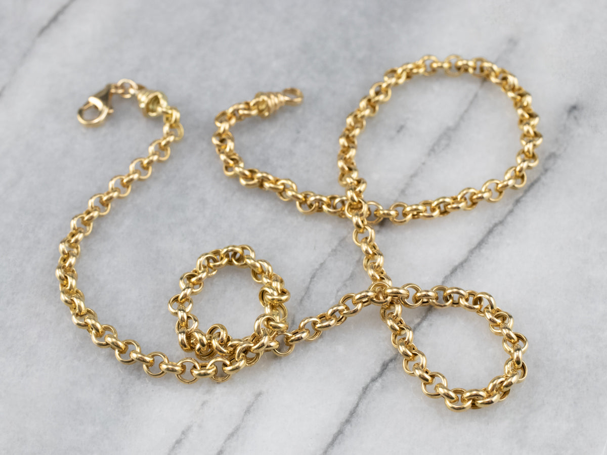Metal: oro amarillo de 14 quilates. Ancho de la cadena: 3,0 mm Longitud de la cadena: 22 pulgadas Marcas: "14K" estampado en el cierre.