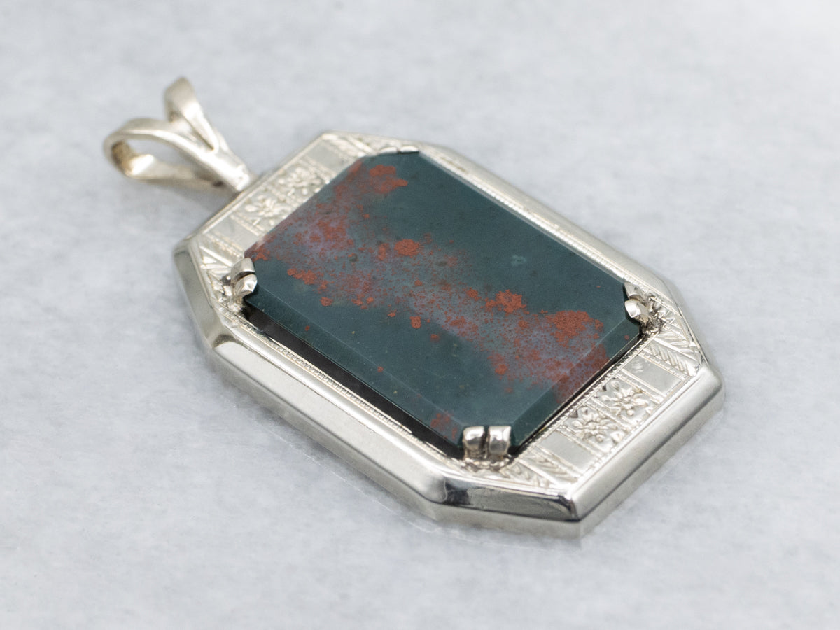 Metal: 14K White Gold Gem: Bloodstone Gem Measurements: 13.0 x 18.0 mm, Rectangle Cut Measurements: 19 x 35 mm, with bail Marks: "14K" Stamped on the reverse