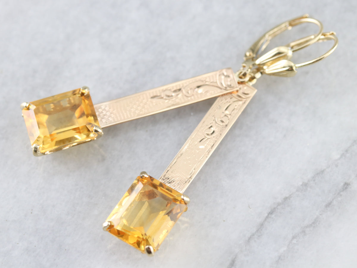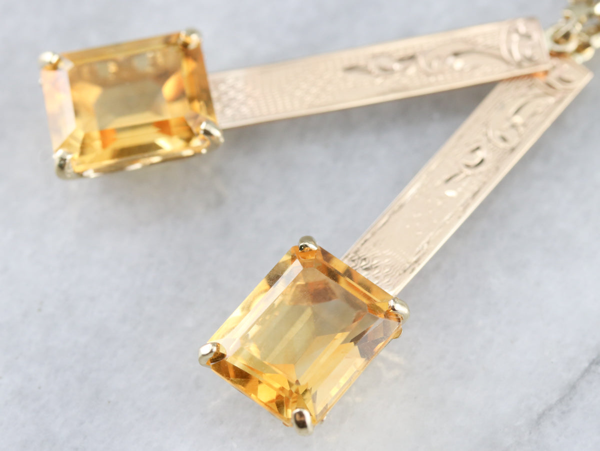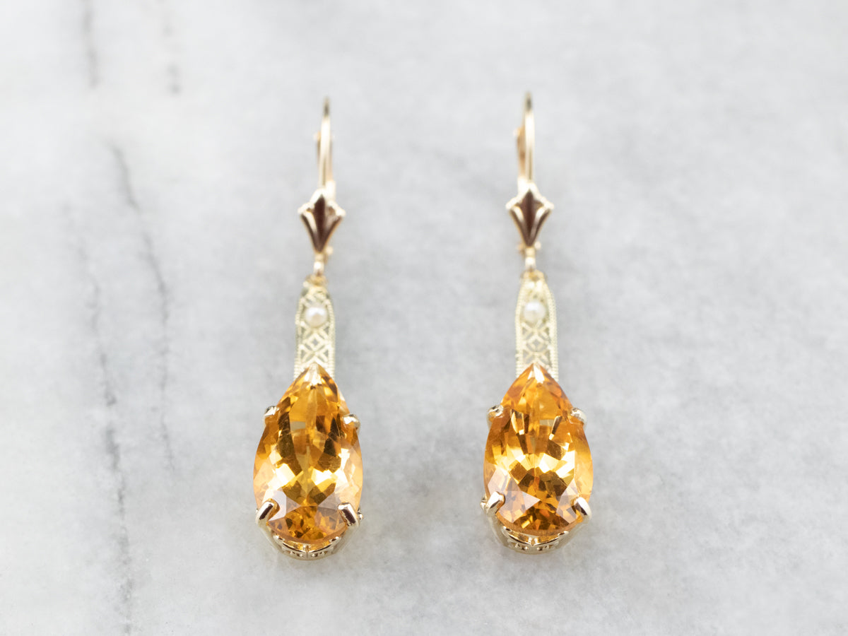 We've created these exceptional drop earrings from and antique bar pin. These enamel centers have creamy white seed pearl down the center leading the eye into the stunning gemstones at their base. These citrines are big and bold, the color is warm, orangey yellow with plenty of sparkles!