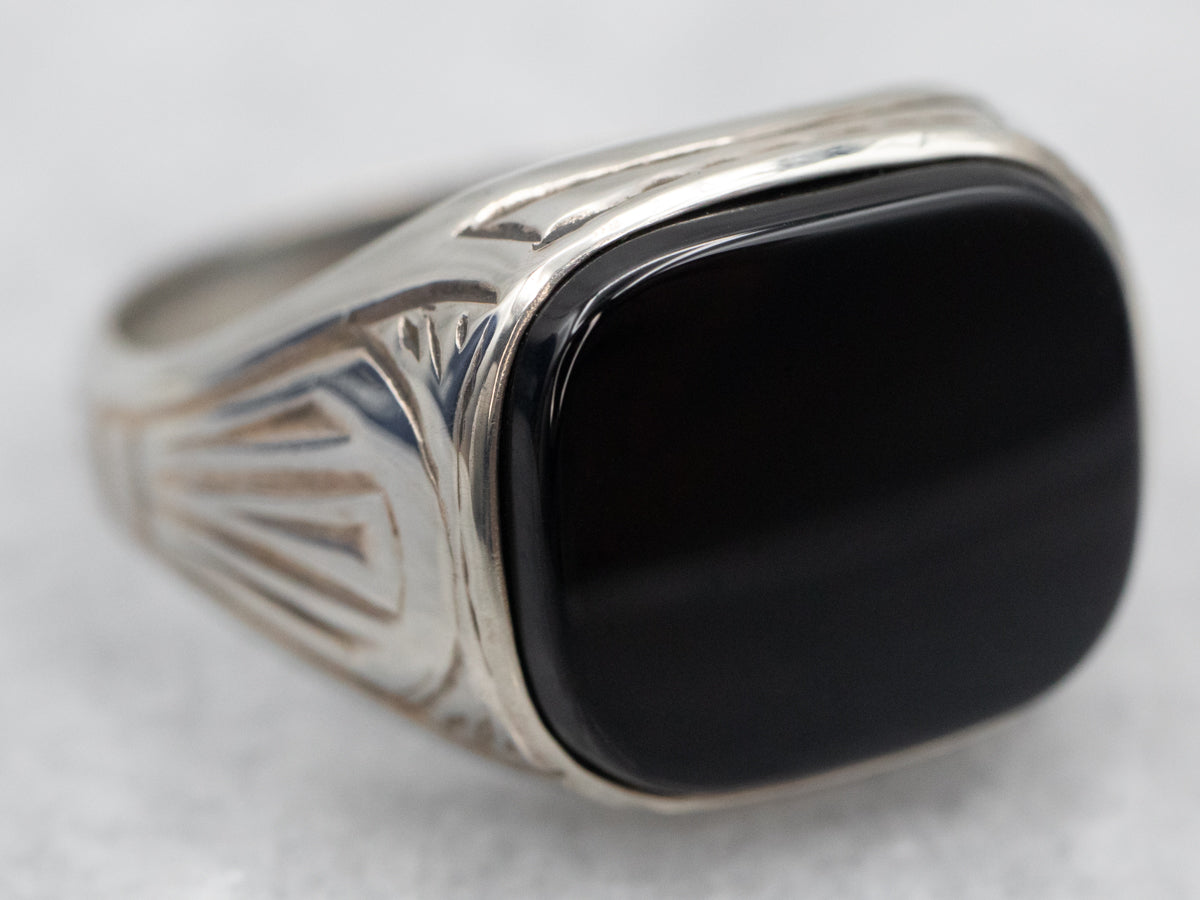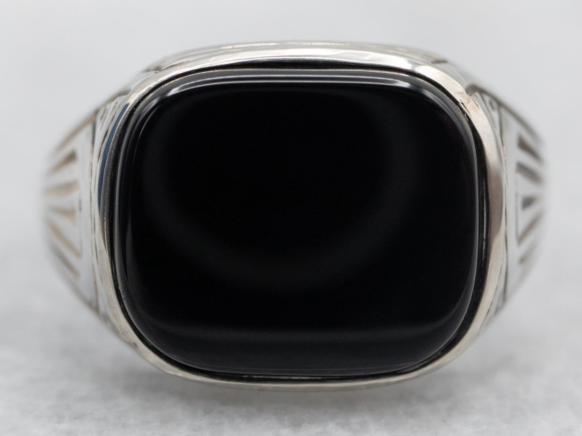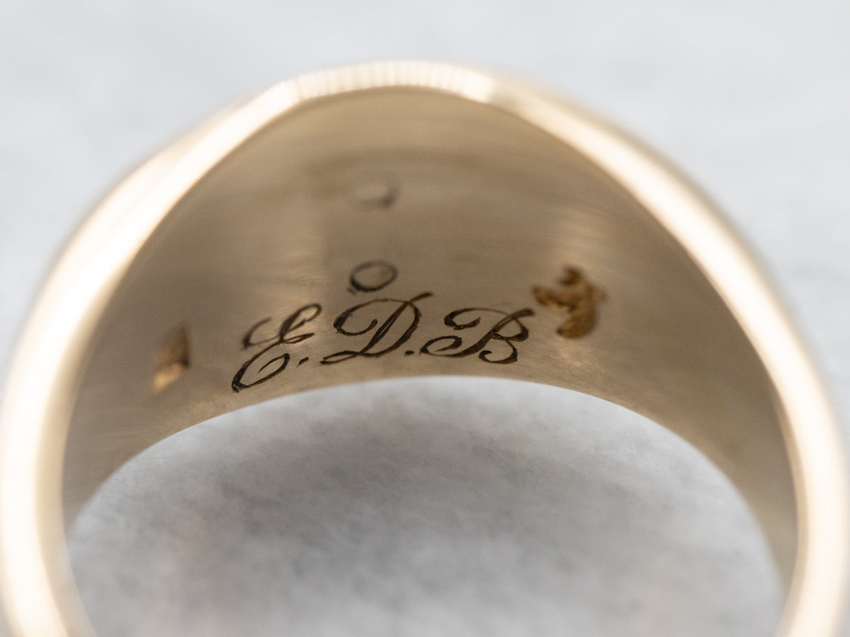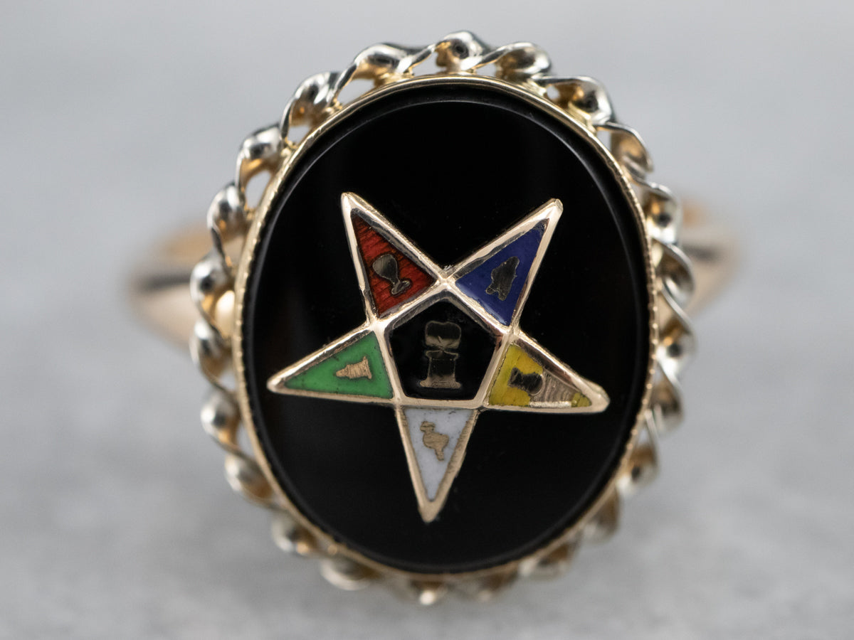 This Order of the Eastern Star ring features gorgeous enameled details amongst the bold black onyx backdrop. Crafted of antique 14-karat yellow gold, this Victorian era ladies' piece is in wonderful condition with a perfect polish!