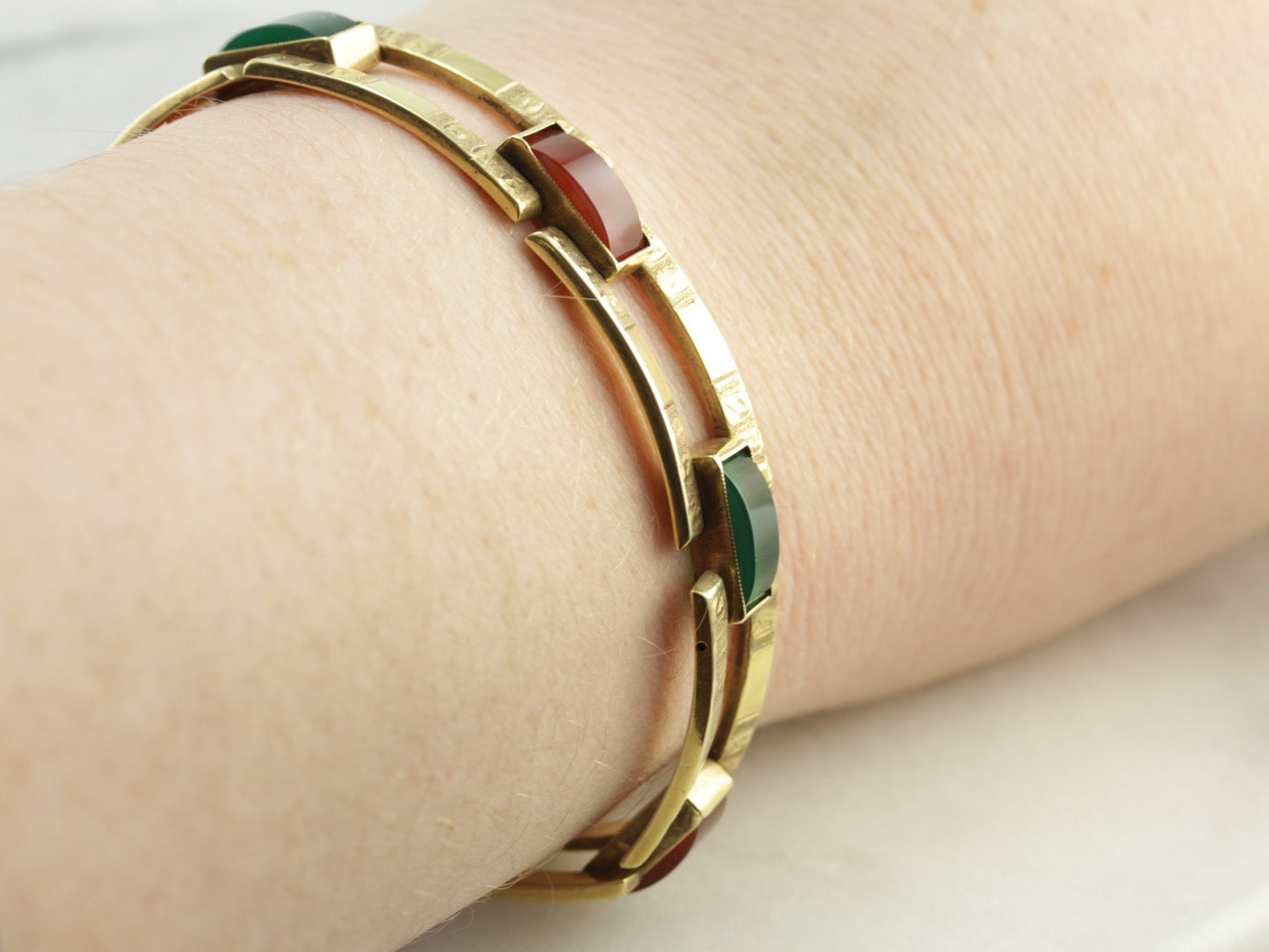 Dating to the late 1920's, this bracelet is a fantastic green gold! The links are shining and highly polished, and the hinge mechanisms work perfectly! Set in each link is a cabochon, a long, slightly domed, geometric stone. They alternate between Green Onyx and Carnelian, and the quality of the cutting leads one to believe they were set, and perhaps the whole bracelet was created, in Germany!