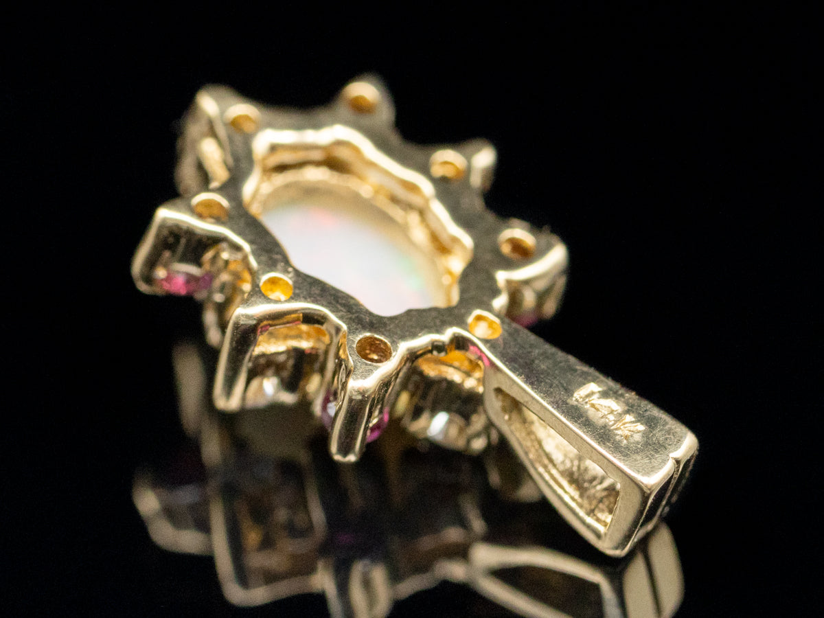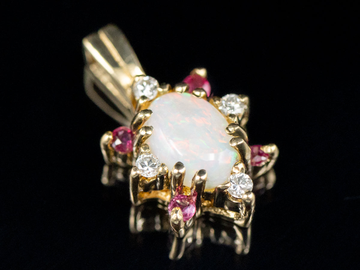 Every color of the rainbow seems to spark through this beautiful opal, depending on the direction it's viewed from. Truly fine in clarity and perfectly cut and polished, this opal has a luscious feel, as though the green, orange, pink and even blue sparks were caught in a pool of liquid light. This combination of opal and fine, sparkling diamond halo, creates a look suitable for any occasion!