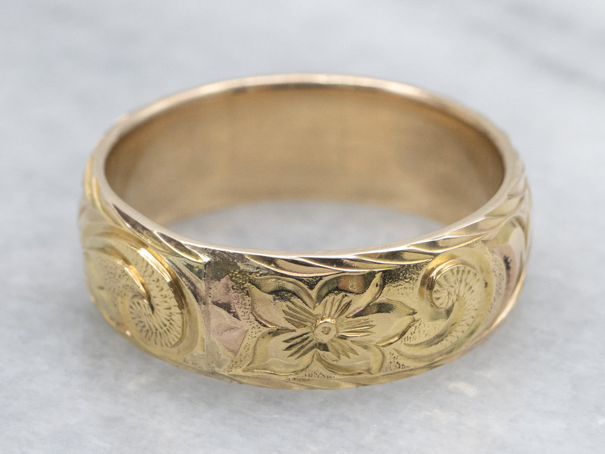 A distinguished vintage band showcasing an elegant botanical motif rendered in contrasting two-tone gold. This refined piece exemplifies timeless craftsmanship, blending warm yellow and white gold in a harmonious design that speaks to both classic sensibility and artistic detail. Perfect for the discerning gentleman seeking a wedding band or statement ring with historical character and enduring sophistication.