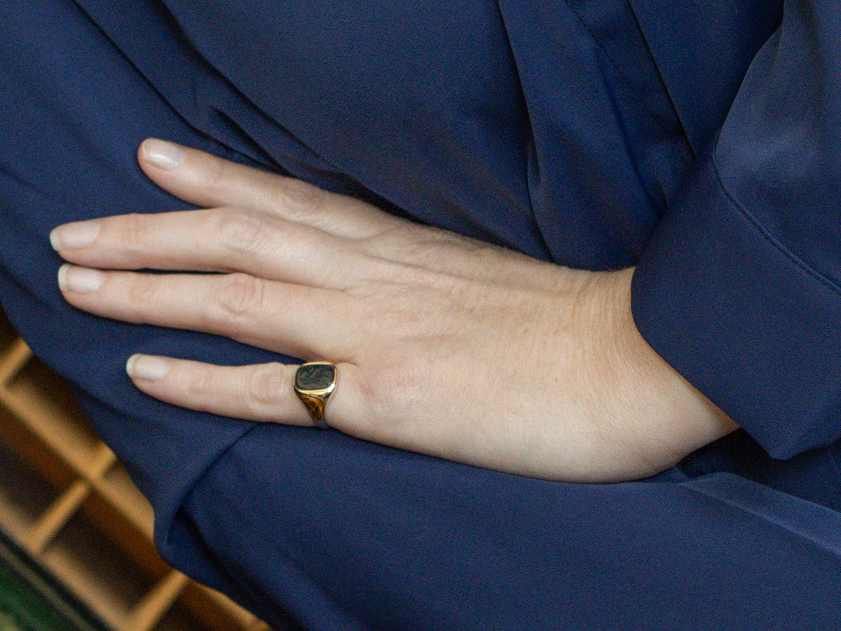 This elegant yellow gold ring features a flush-set bloodstone intaglio carved with personalized initials that reverse when impressed into wax—a timeless tradition for creating distinctive family crest seals. A sophisticated piece that merges heirloom craftsmanship with refined everyday elegance.