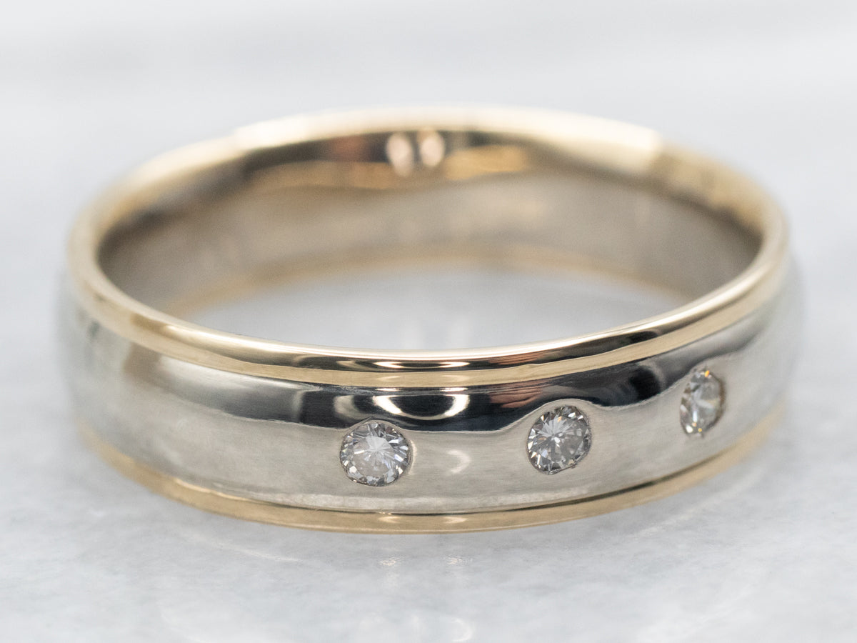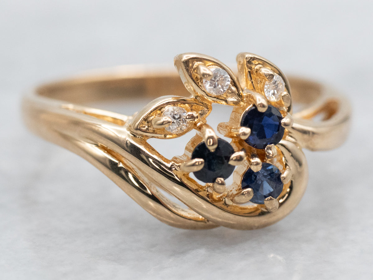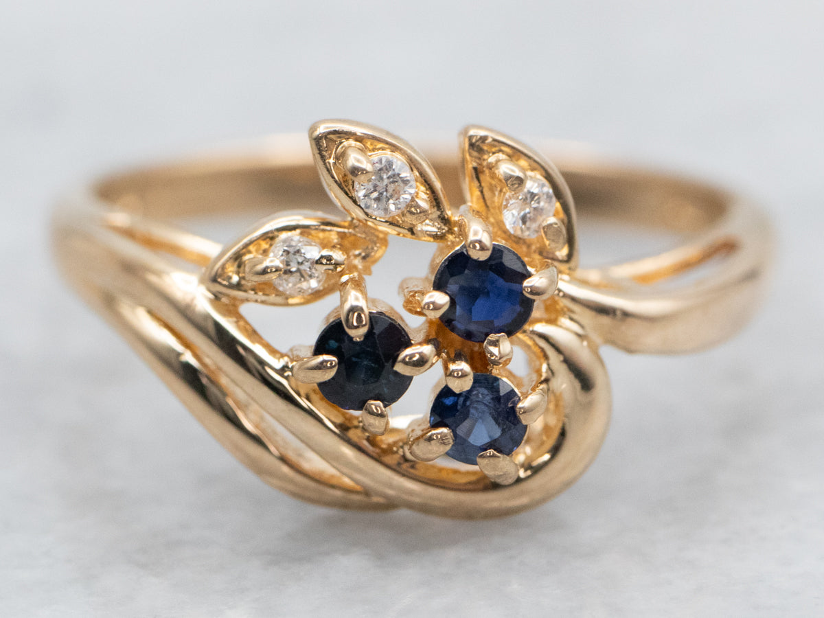 This handsome, 14-karat gold ring has a completely smooth domed profile and features three flush, or "Gypsy set" gems in the center, reminiscent of the style that was popular in Victorian times. The piece is set with a deep navy blue sapphire and diamonds, a bright polish, reflecting plenty of light on the finger!