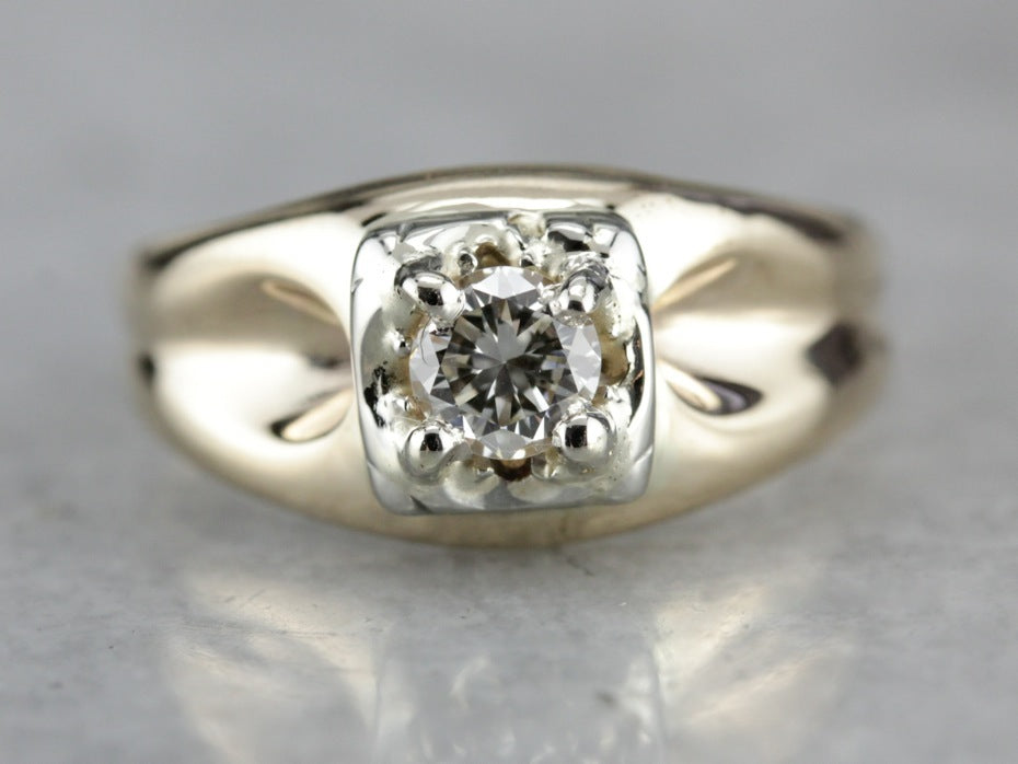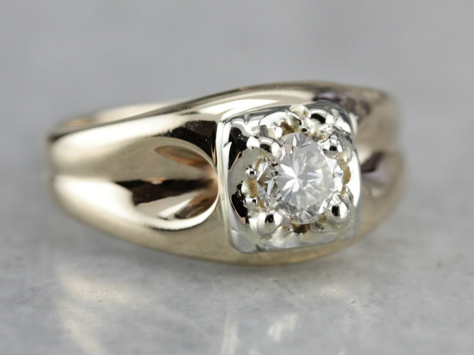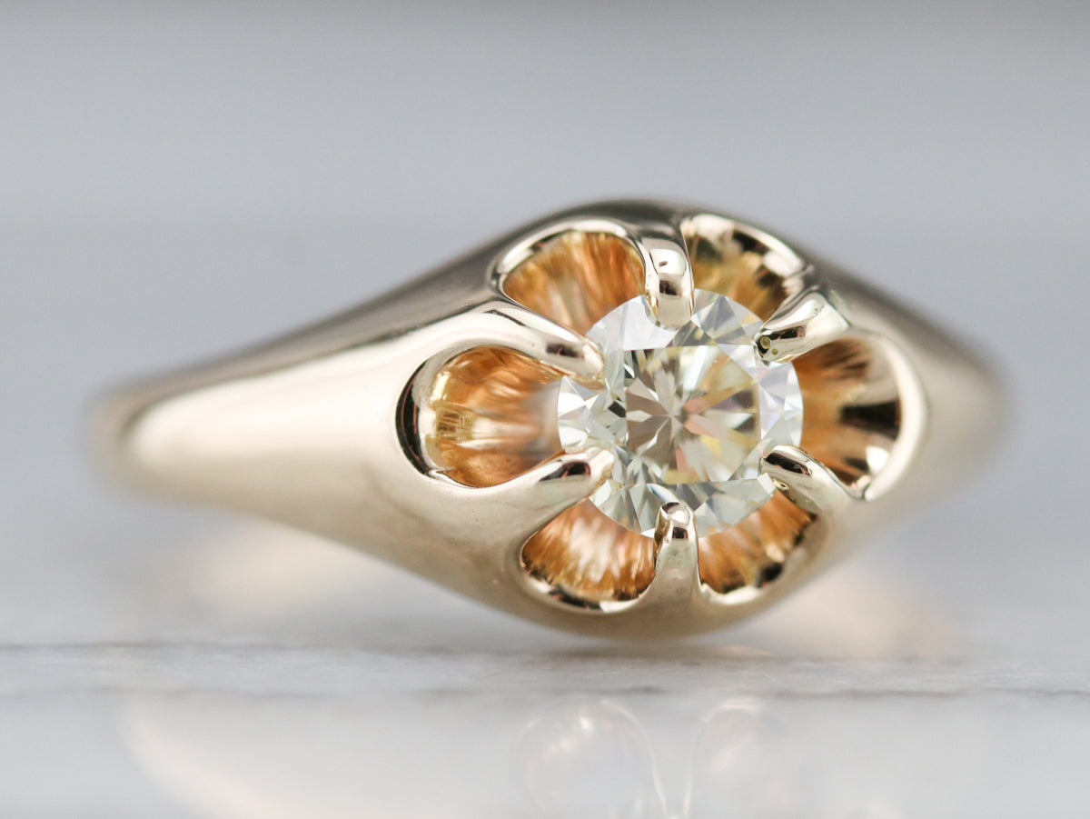 Simplicity combined with a classic Victorian style! This ring is crafted gold with a soft polish. In the center, a beautiful diamond is held in a claw-like mounting, the prongs rising out of the metal band on every side to hold the stone. The ring sits flat and has a very low profile, making it comfortable on the hand and easy to wear every day.