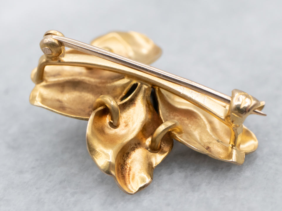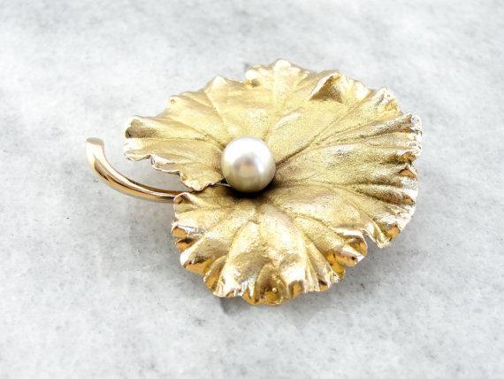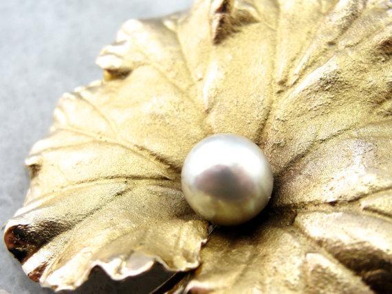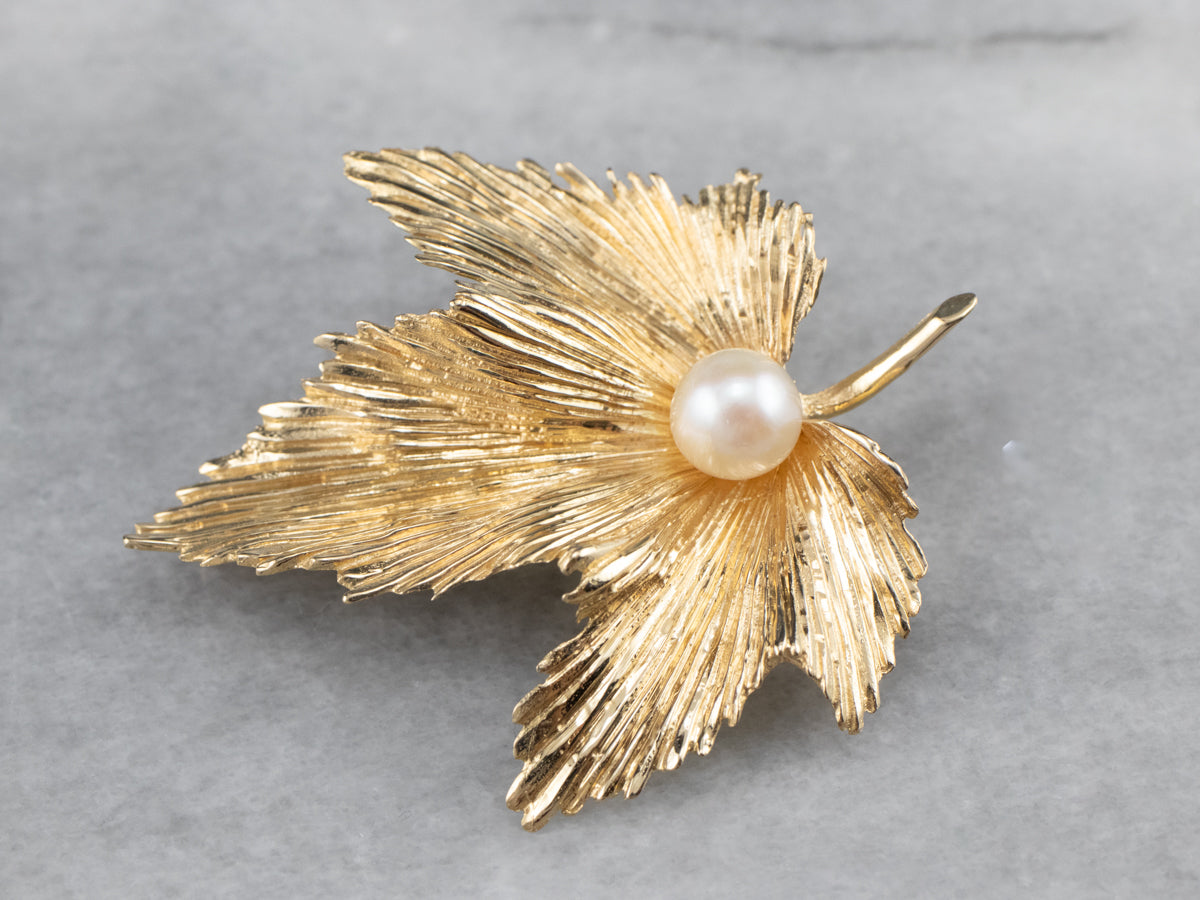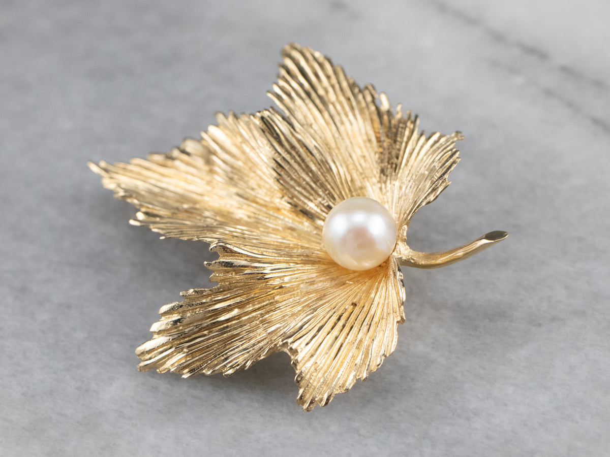 Absolutely outstanding! This vintage grape leaf brooch is crafted of 14 karat gold, finished with a very realistic texture. At the center is a luscious pearl with a creamy, almost metallic sheen.