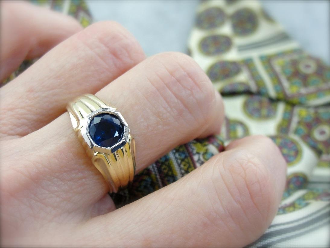 This Retro, vintage ring was made for a man but would be equally attractive on a ladies hand. The style is simple, the bright green gold transfers subtly to white, and is an excellent compliment to the intense blue of the gorgeous, perfectly set sapphire.
