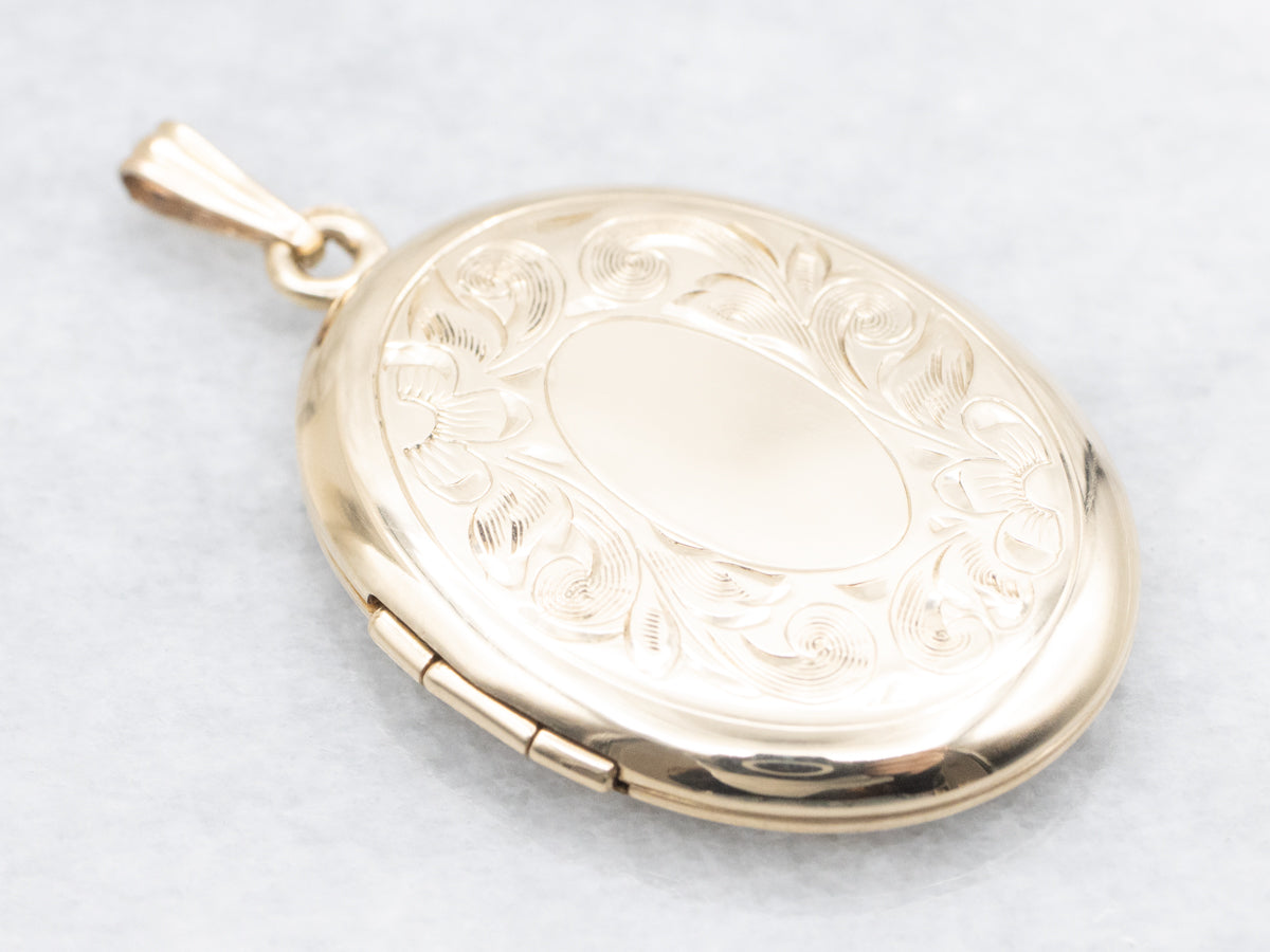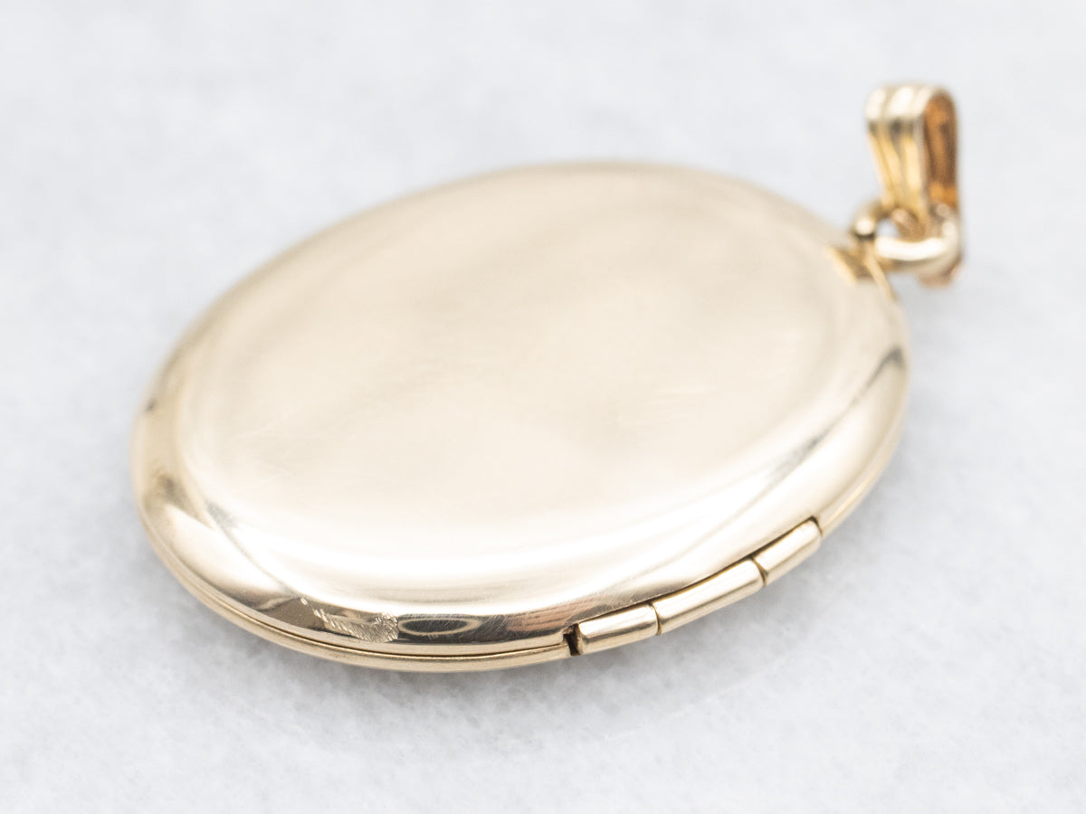 What a stately Victorian piece! Crafted of antique bloomed gold, this oversized oval locket features its orgional monogram "FHM" in scrolling ornate script, while the reverse is simply polished.