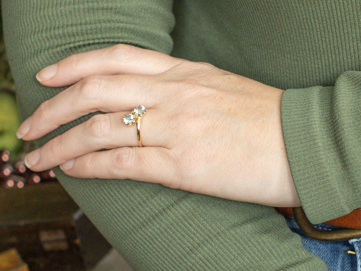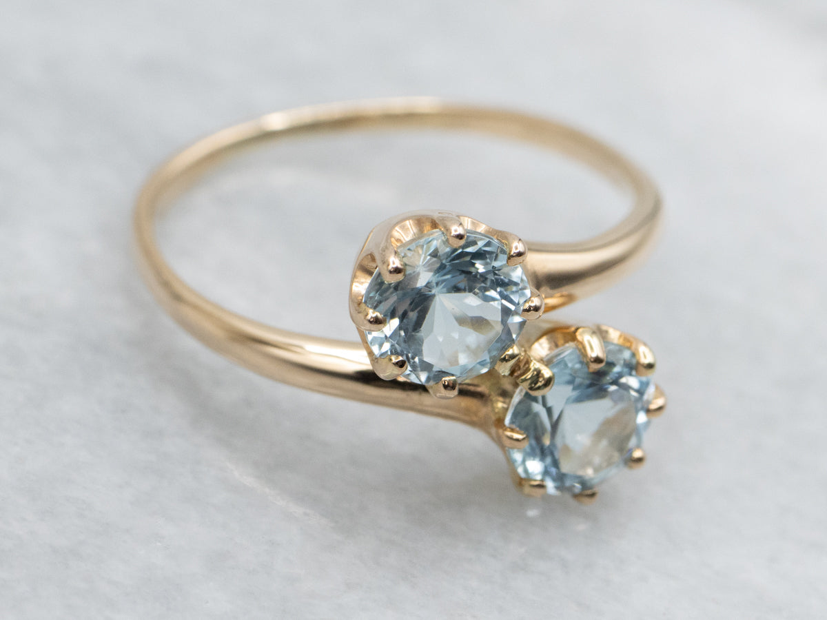 Sweetly stunning, bypass-style rings are timeless, having swept through the ages and been set with every possible gemstone. We mounted this vintage setting with two sparkling gems, blue topaz from our collection of fine gemstones!