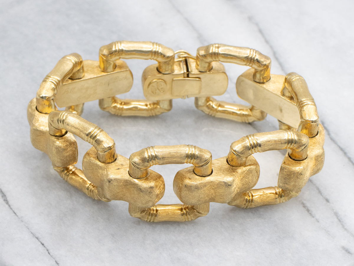 Express yourself with Vintage era flair found in this bold 18K yellow gold bracelet; a remarkable piece that effortlessly balances timeless appeal with versatility! This flexible bracelet features seven bamboo-shaped links, each measuring 22 mm. in width and 25 mm. in height, adorned with a brushed texture that catches the eye.
