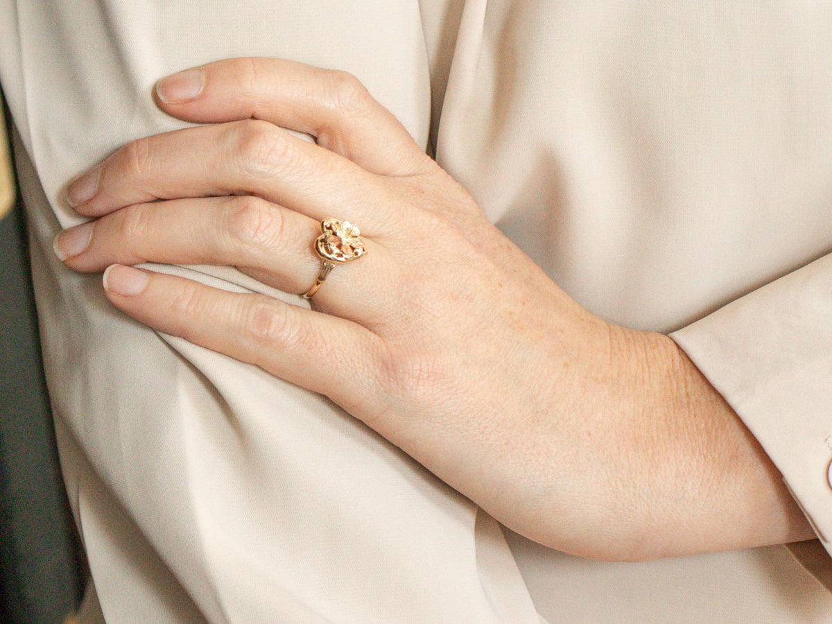 This pretty ring was crafted in the mid-century. Its center features 10-karat gold petals and leaves of rose gold, forming a sweet bouquet. The simple heart-shaped frame provides a lovely backdrop for the softly textured petals.