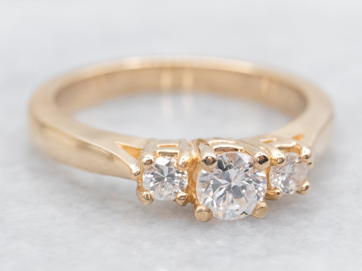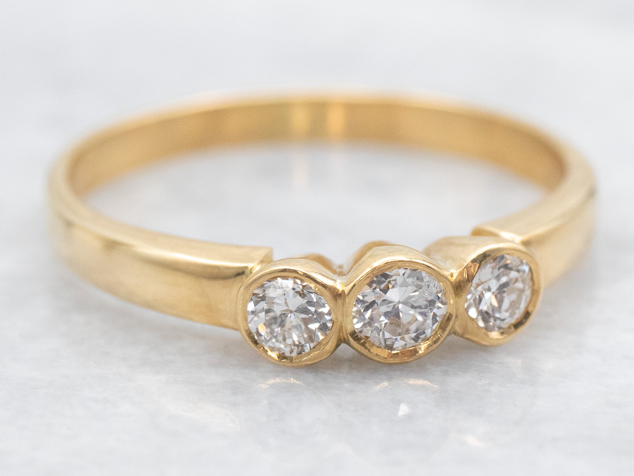 A classic three-stone diamond engagement ring gets a modern twist thanks to the sleek bezel settings. The diamonds are bright and sparkling, contrasting nicely with the warmth of the 18-karat yellow gold. Absolutely timeless, this ring could also be worn as an anniversary or everyday ring!