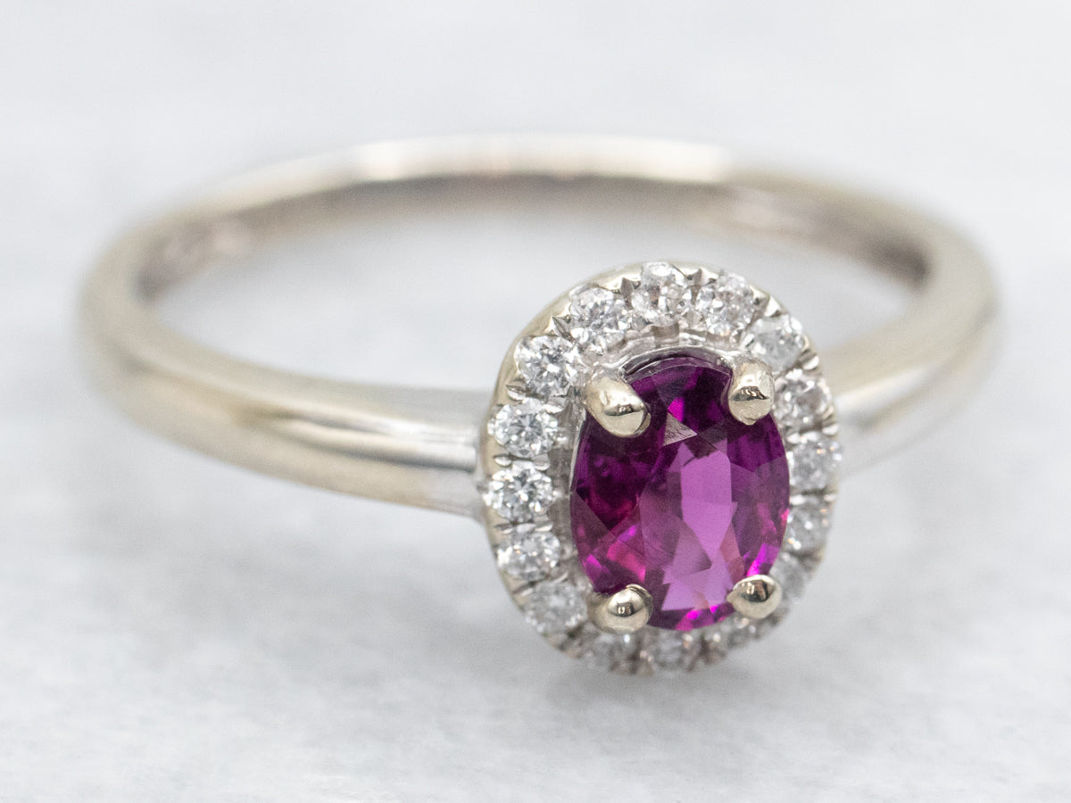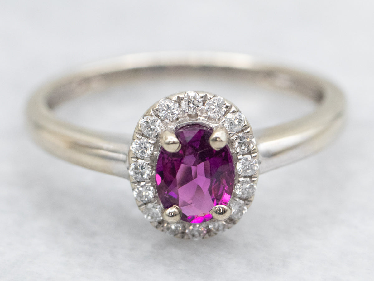 This ring features an oval cut rhodolite garnet accented by a beautiful diamond halo, creating a sophisticated look for any occasion. The cool white gold compliments the raspberry hue of the rhodolite garnet, while the diamond halo adds extra sparkle.