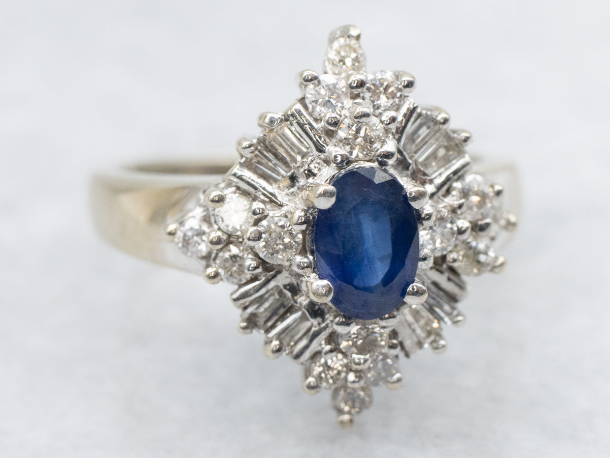 This sapphire and diamond engagement ring is classic, yet impressive. The sapphire is a deep and vibrant ultramarine blue in a stunning cushion cut. Glittering diamonds adorn the shoulders, bordered by scrolling botanical motifs. Crafted of polished 14-karat white gold, this ring is sure to attract envy!