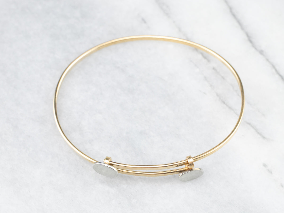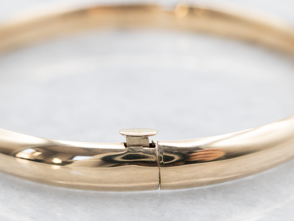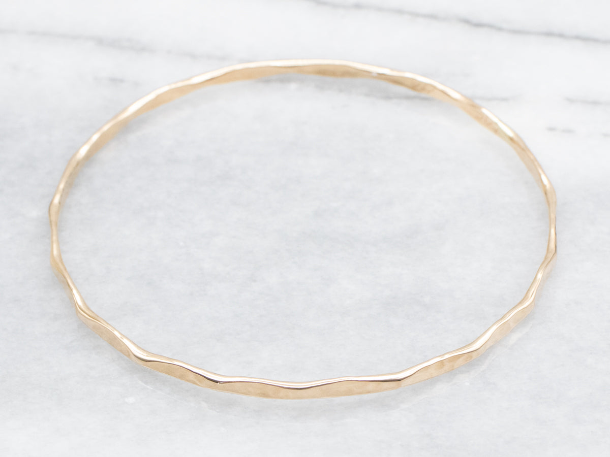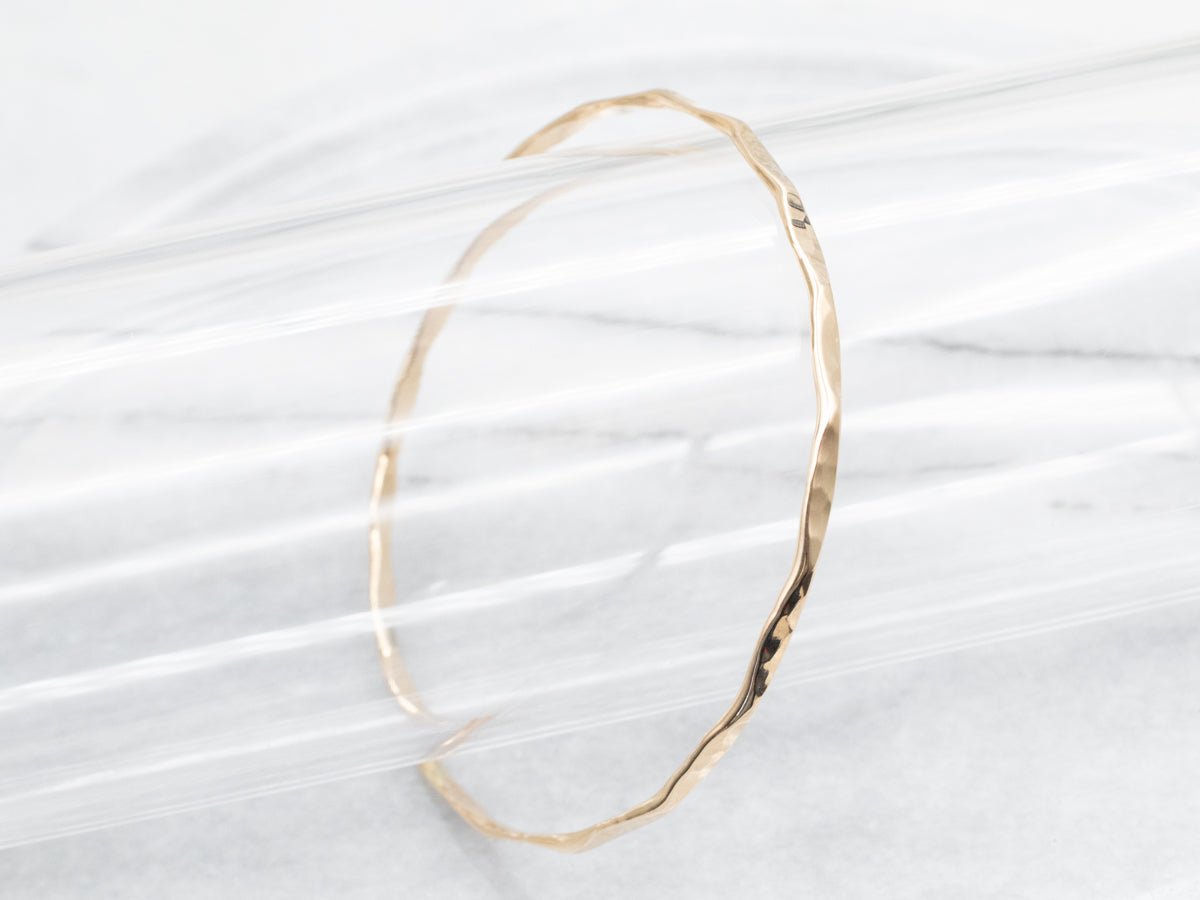 This modernist 14 karat gold bangle has an urban feel, an elegance that is timeless in its simplicity. Perfect for wearing with a formal dress, this hammered finished yellow gold bangle bracelet would make a wonderful anniversary gift!
