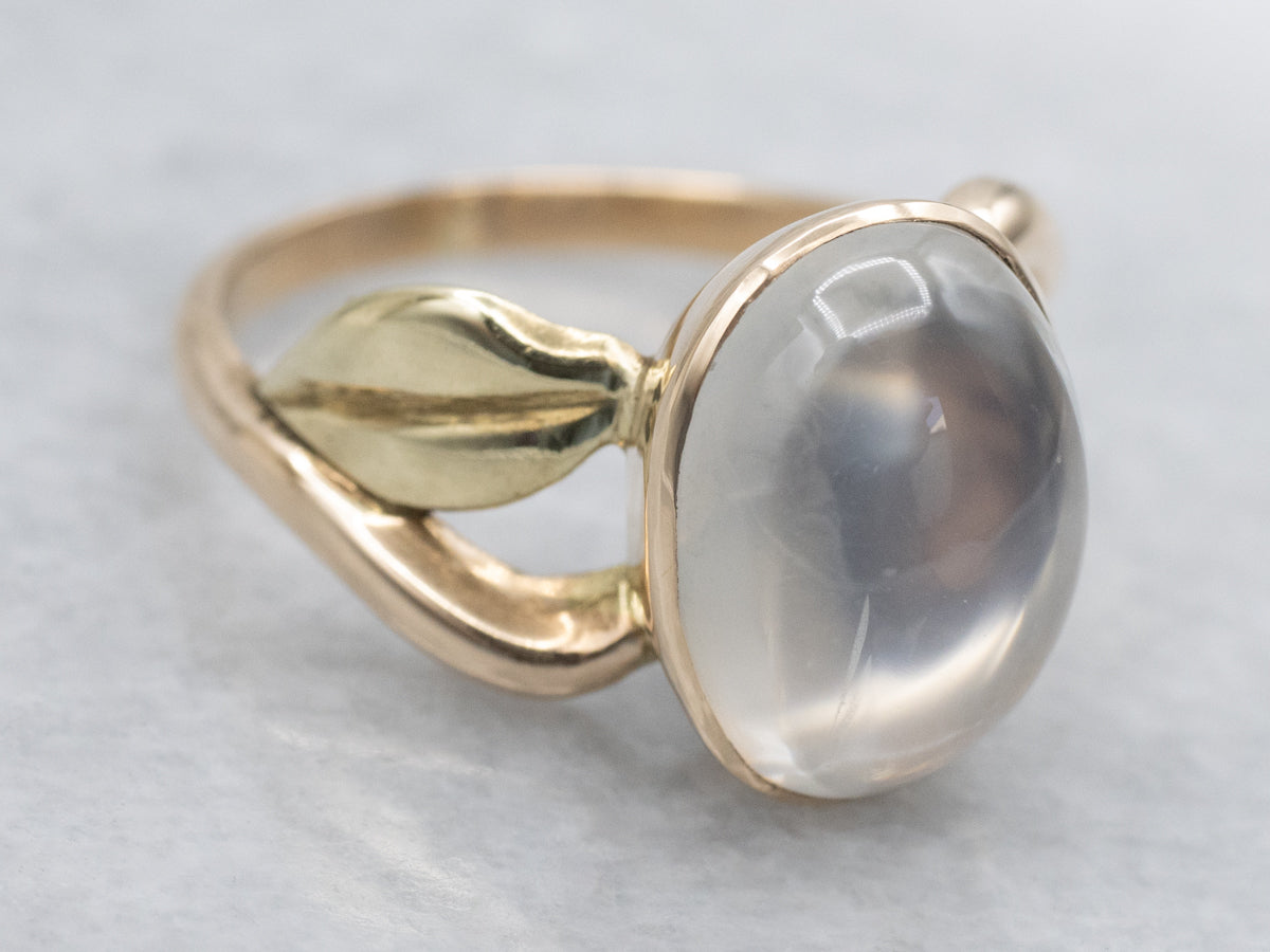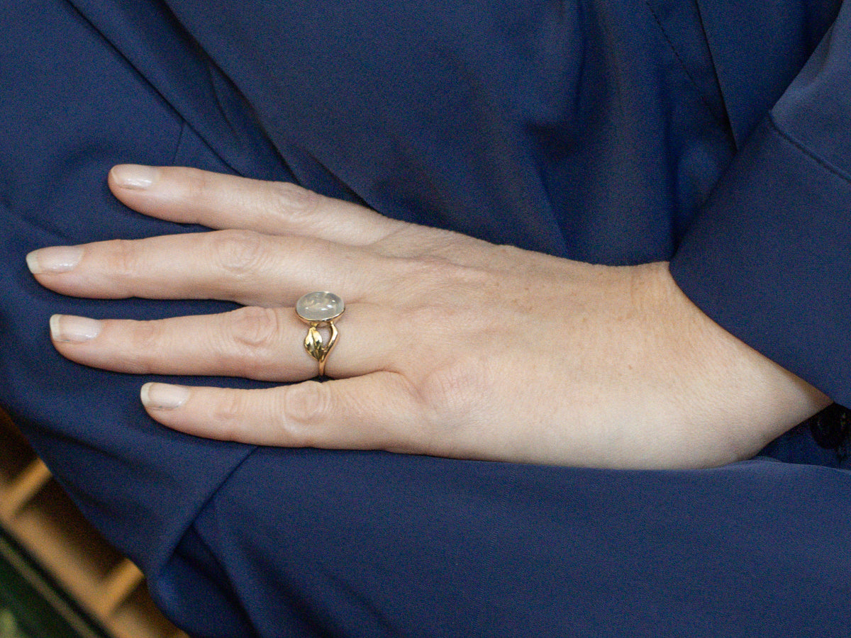 A luminous moonstone takes center stage in this contemporary yellow gold ring, where organic botanical motifs frame the stone with refined elegance. The soft, ethereal glow of the moonstone pairs beautifully with warm yellow gold, creating a piece that balances modern design sensibilities with timeless sophistication. Perfect for those who appreciate nature-inspired jewelry with an understated, polished aesthetic.