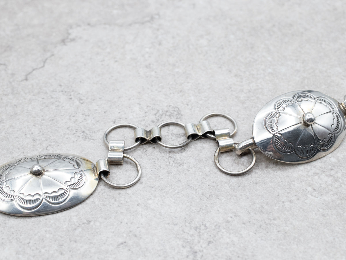 Beautifully kept, vintage concha pieces are generally made of coin, or pawn, silver and were crafted in the American Southwest, likely by a Navajo craftsman. We've updated this with a simple gold bail to create a unique pendant.