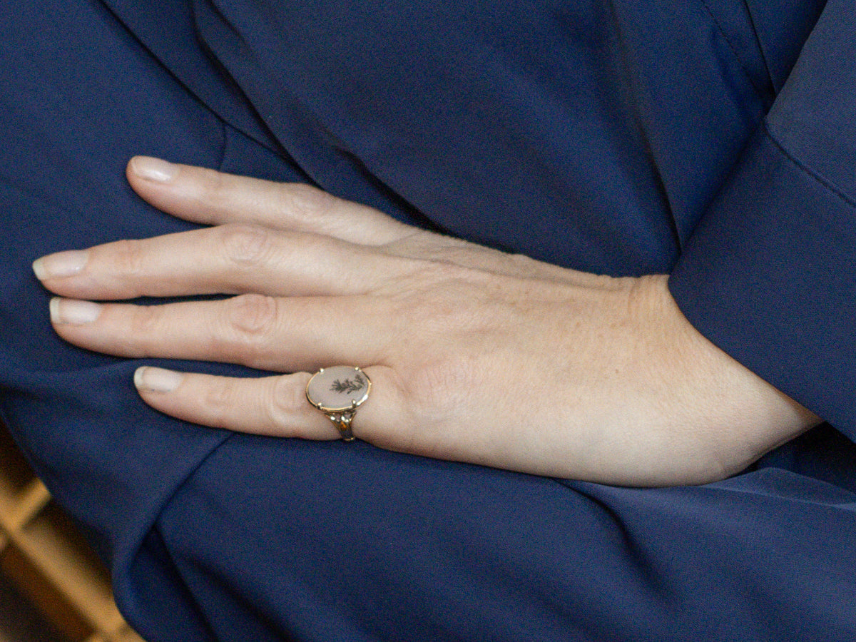 A striking solitaire design showcasing a captivating oval-cut dendritic agate, cradled in warm yellow gold. The stone's natural tree-like inclusions create an organic, one-of-a-kind pattern that draws the eye. This elegant ring celebrates the beauty of nature's artistry, offering a distinctive alternative to traditional gemstones while maintaining timeless sophistication.