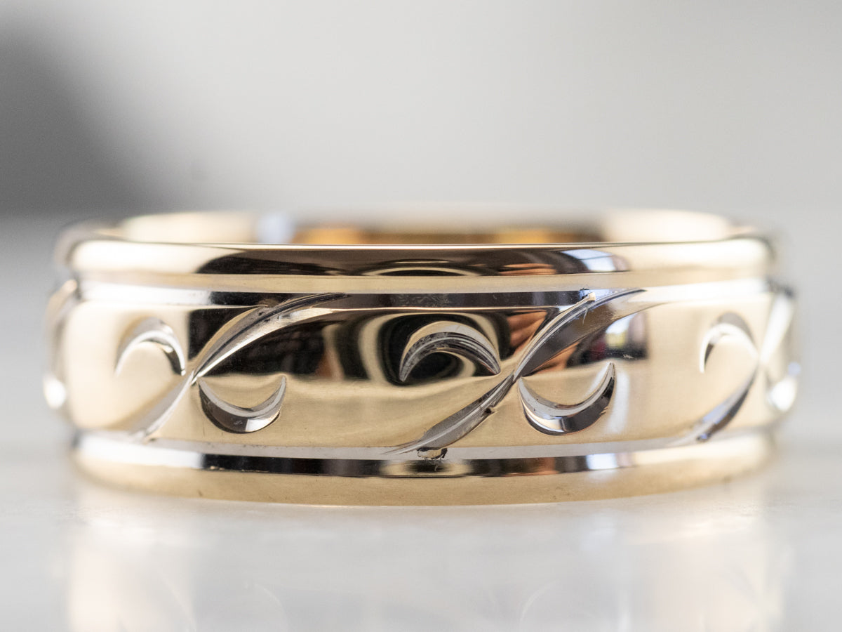 This wedding band has a crisp, polished pattern that plays off two different colors of gold to marvelous effect! Sleek and stylish, this ring would also be worn as an everyday band.