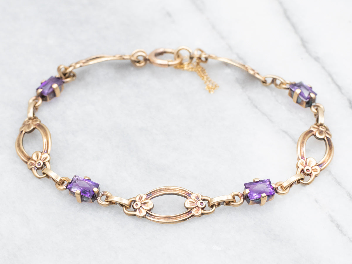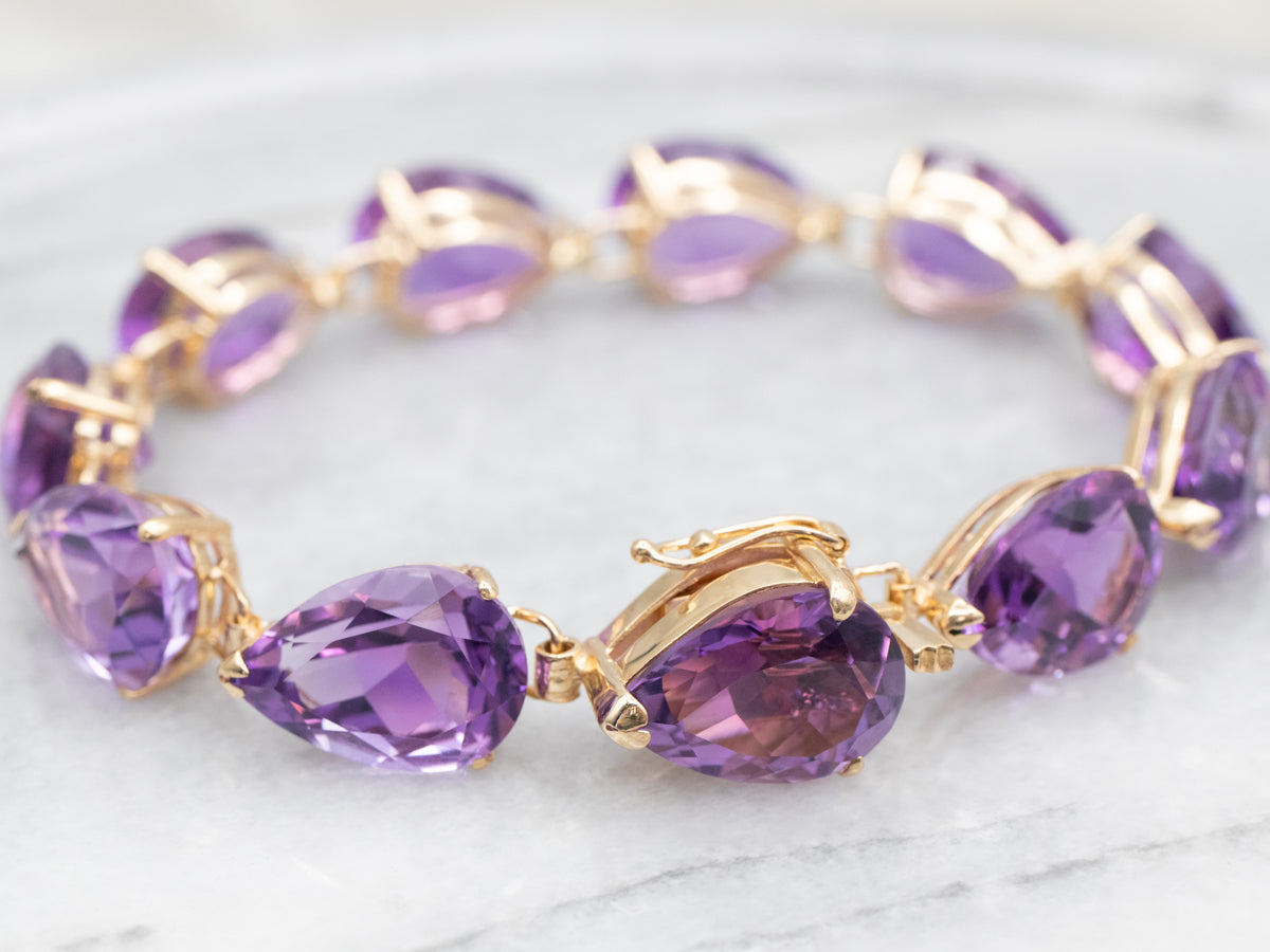 ¡Disfruta de la elegancia de esta pulsera! Adornada con brillantes amatistas talla pera, esta pulsera es el complemento perfecto para cualquier conjunto sofisticado. ¡Eleva tu estilo y rezuma clase con esta exquisita pieza de joyería!