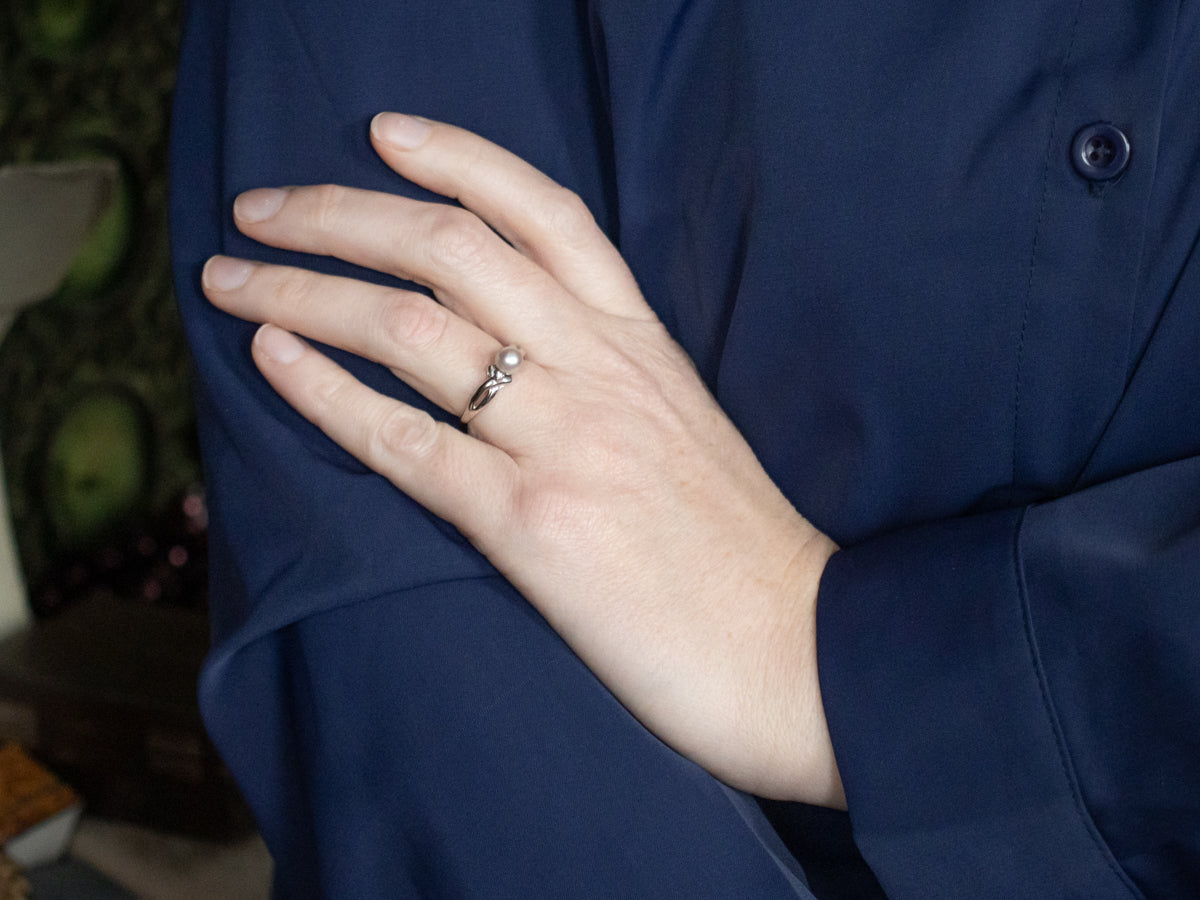 Elegant white gold band featuring a lustrous pearl at its center, accented by sparkling diamonds arranged in a graceful twisted design. This sophisticated ring combines timeless pearl elegance with brilliant diamond sparkle, creating a refined piece suitable for engagements, anniversaries, or special occasions. The intertwining white gold setting enhances the natural beauty of both gemstones while offering enduring style and wearability.