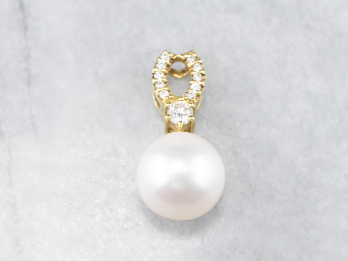 ¡Este colgante es simple pero lujoso! Elaborado en rico oro de 18 quilates, este colgante está engastado con una perla blanca clásica y realzado con hileras de diamantes brillantes y resplandecientes. ¡Fácil de usar, este colgante pasa muy bien de la oficina a una salida nocturna!