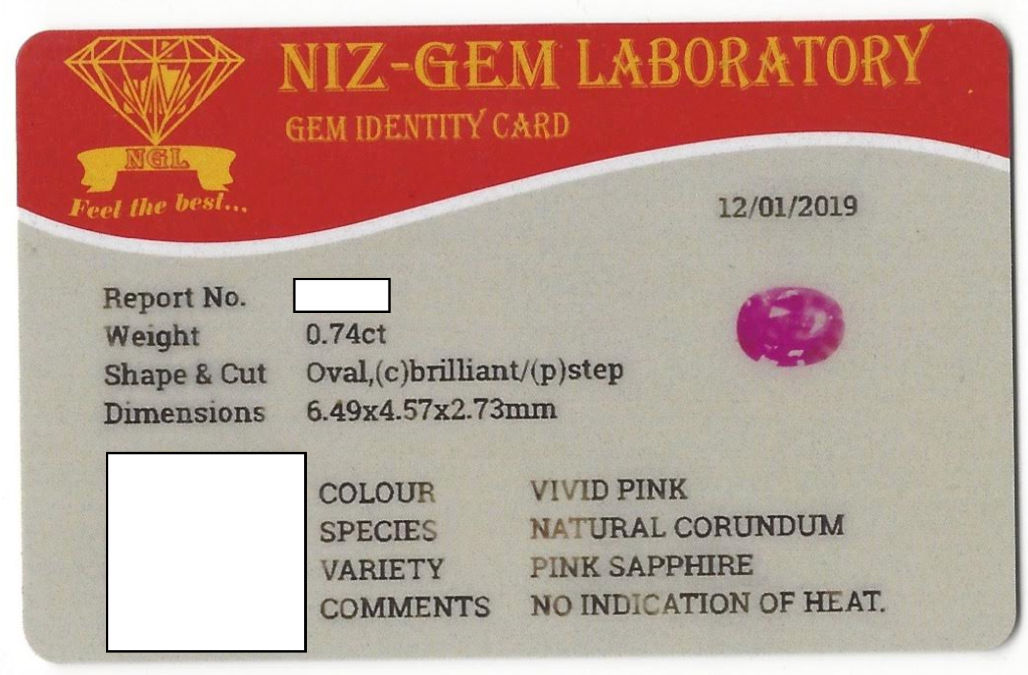 Metal: 14K Yellow Gold Gem: Pink Ceylon Sapphire .74 Carats Gem Measurements: 6.5 x 4.5 mm, Oval Ring Size: 6 Marks: "<><>14K" Stamped on the inside band NIZ-Gem Laboratory Report Number: 18****