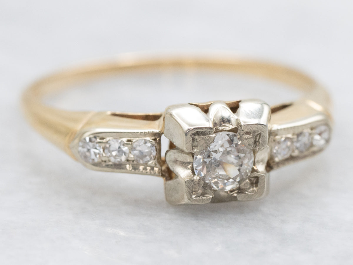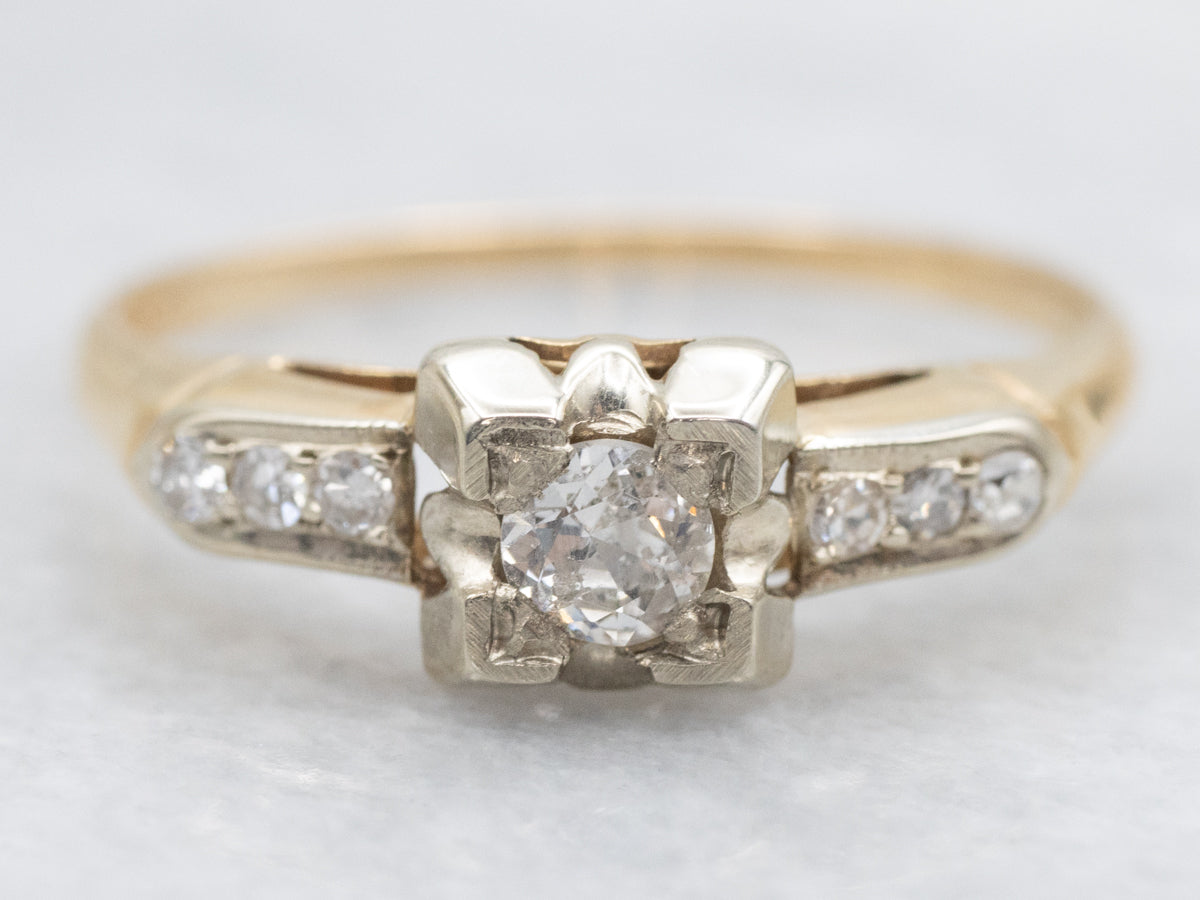 This gorgeous diamond ring exudes vintage charm. Three diamonds are showcased with illusion-style heads, while diamond accents add extra sparkle. Crafted with both platinum and white gold, the cool tone of the metal highlights the radiance of the diamonds.