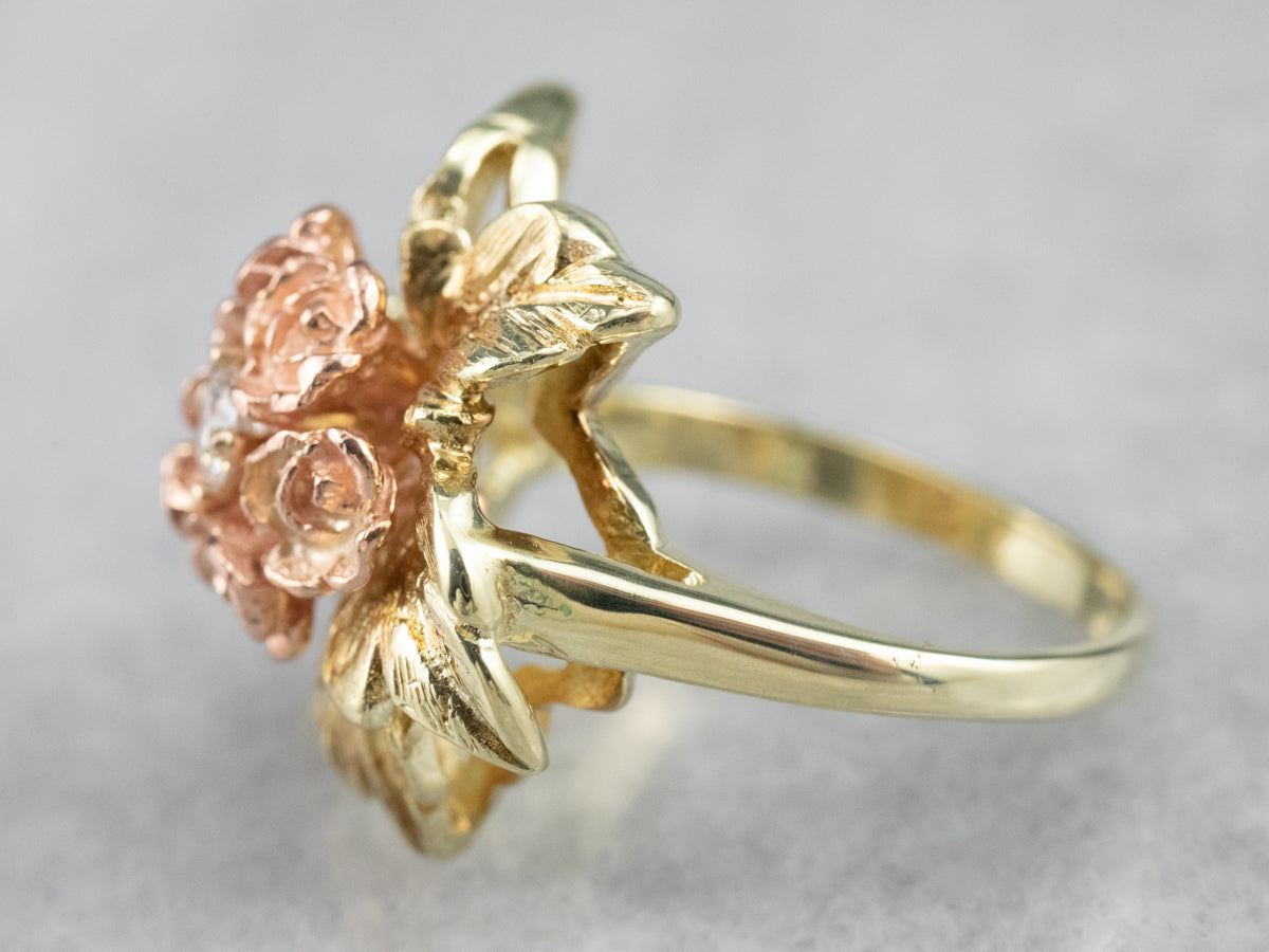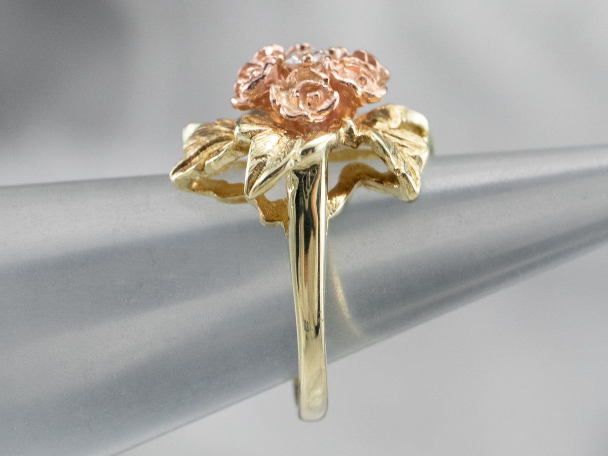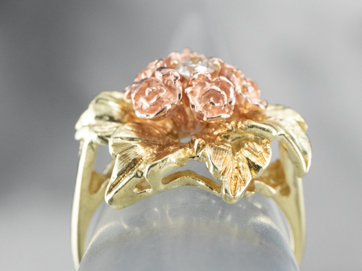 This pretty ring was crafted by the mid-century, with 14 karat gold in leaves and roses of rose gold forming a sweet bouquet center. This pretty piece has a stunning round brilliant diamond, a sparkling contrast to the softly textured petals of the flower.