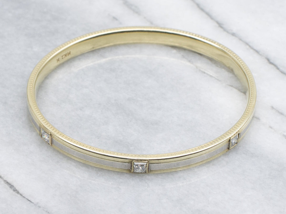 A refined bangle bracelet combining two-tone gold with three sparkling princess-cut diamonds. Intricate etching details enhance its vintage aesthetic, creating an understated yet commanding presence on the wrist. Perfect for those who appreciate timeless elegance and exceptional craftsmanship.