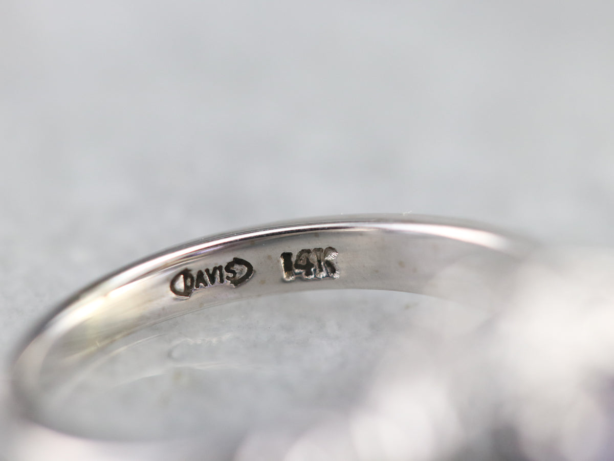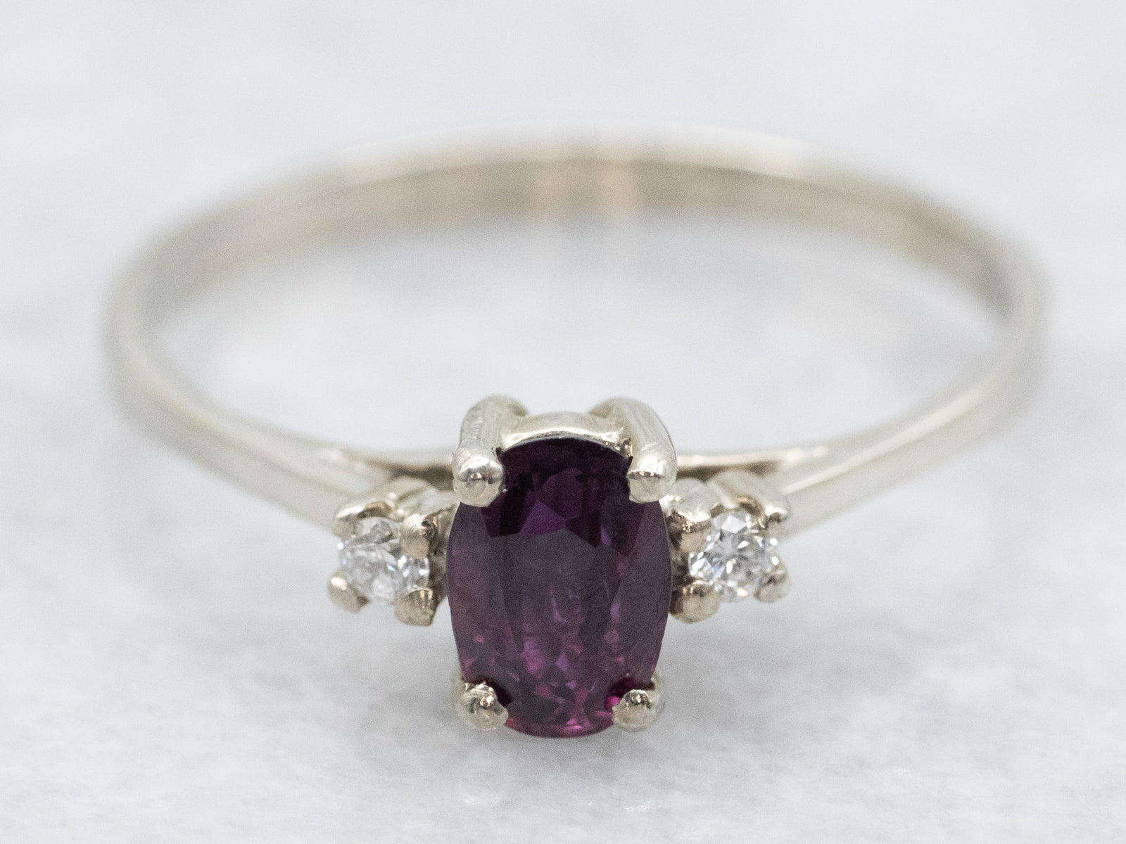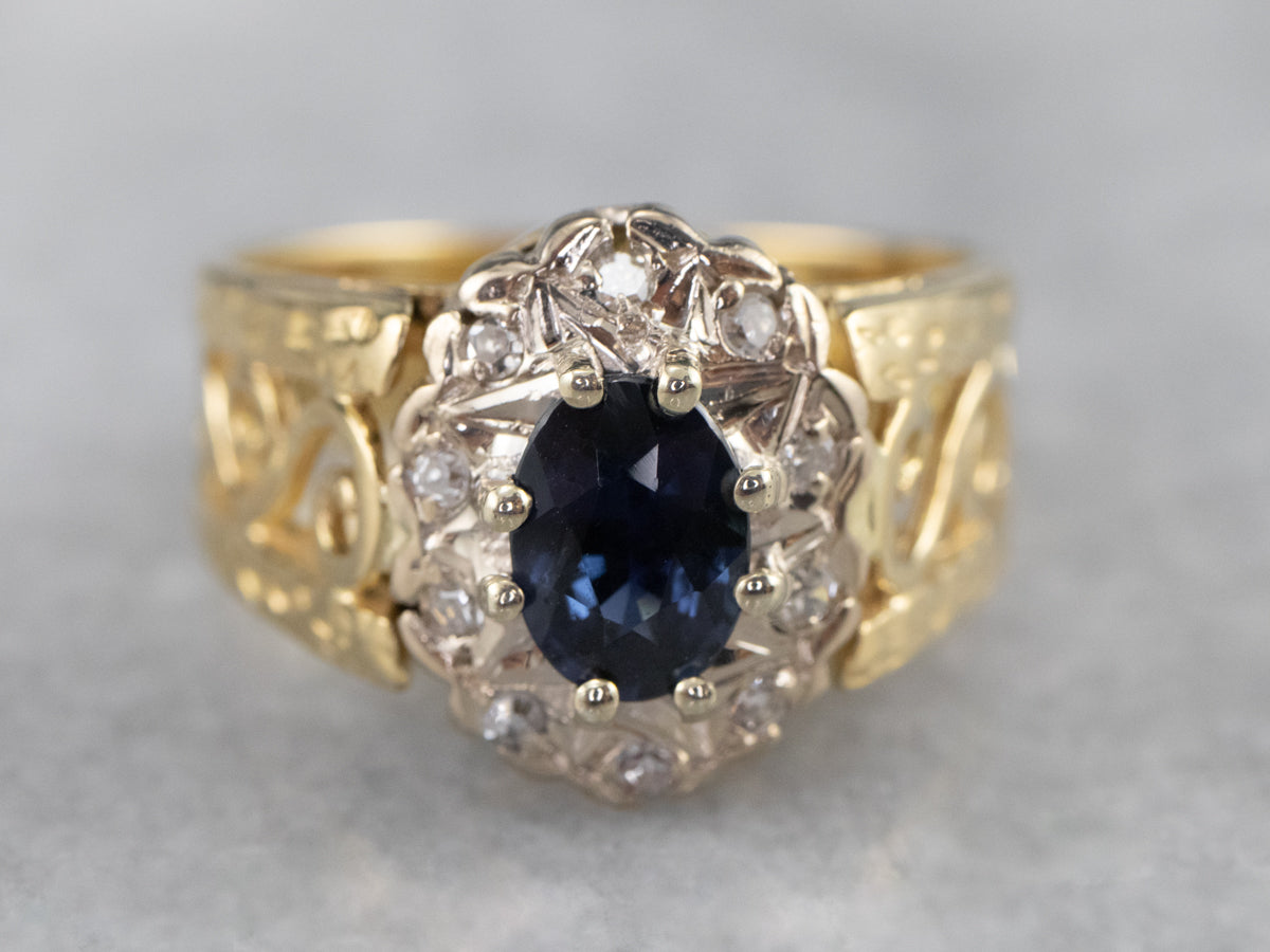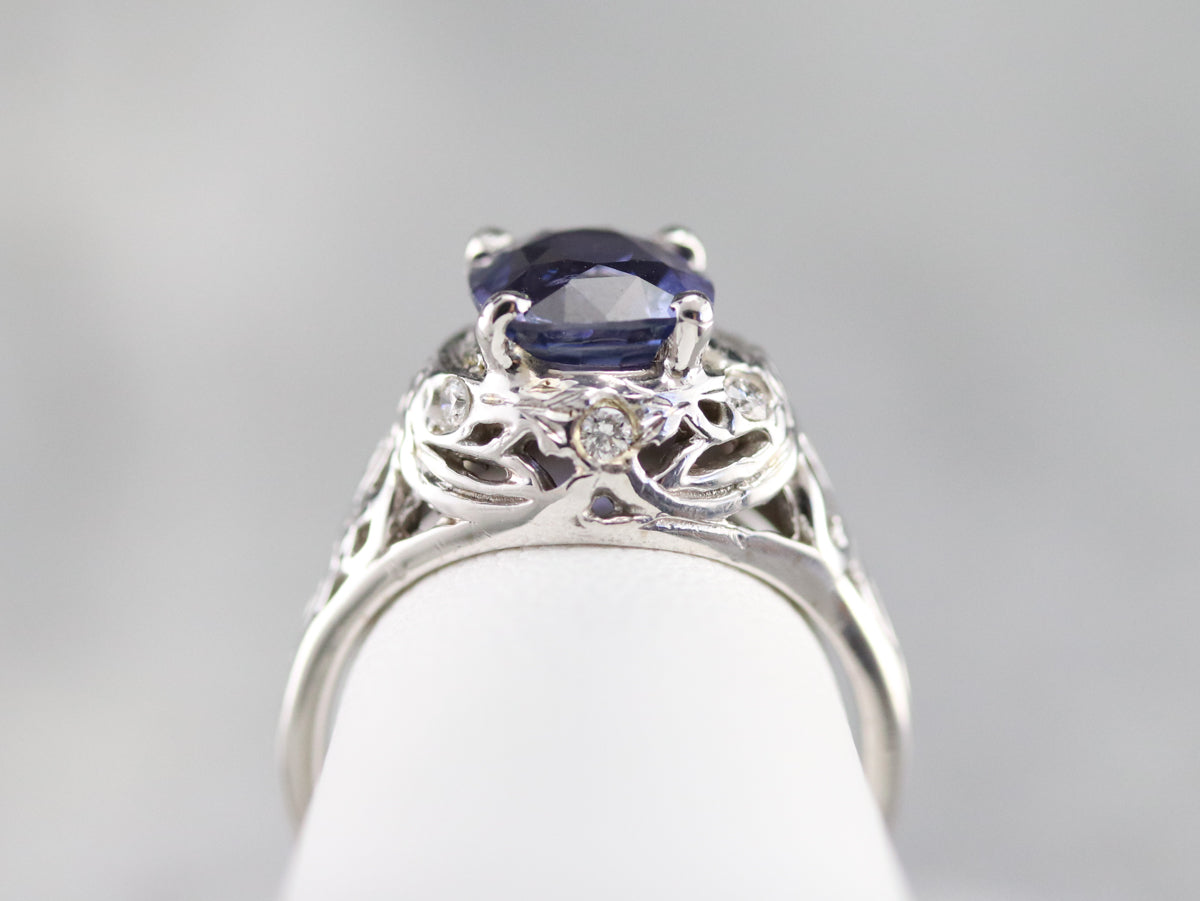 ¡Este anillo de oro blanco con zafiro está lleno de detalles maravillosos! El montaje se compone de una intrincada filigrana que permite que la luz fluya a través del anillo, mientras que los pequeños diamantes decorativos añaden un toque de brillo. El zafiro es de un color púrpura azulado, con matices de violeta y lavanda brillando en sus profundidades. ¡Esta pieza sería un anillo de compromiso único o un regalo de aniversario!