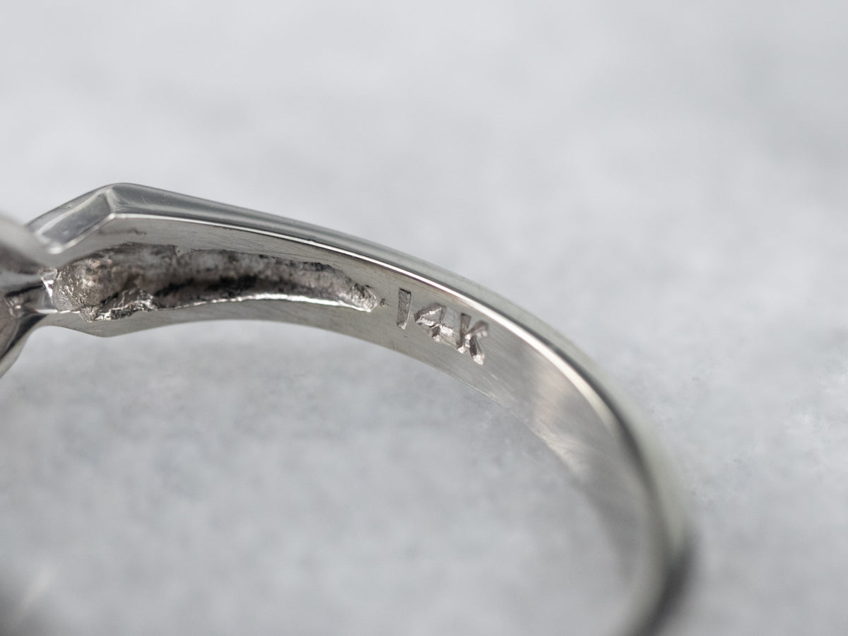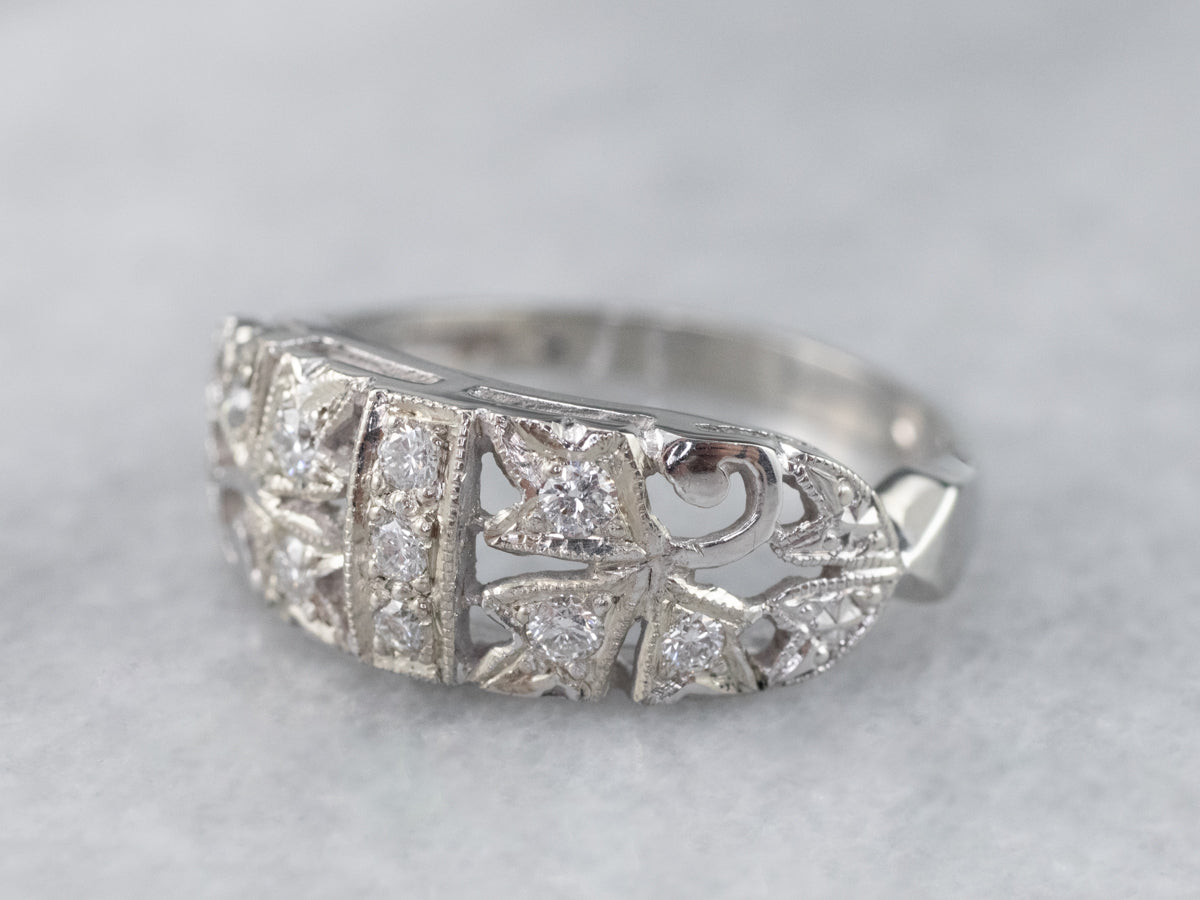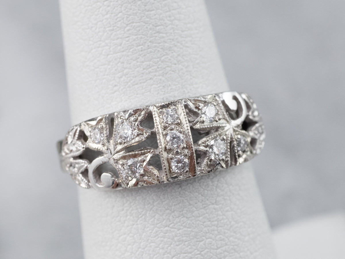 Elaborada en oro blanco pulido con un estilo femenino de los años cincuenta, ¡esta pieza aporta mucho estilo por un precio mínimo! ¡La parte superior está engastada con brillantes diamantes de talla única que brillan en sus entornos botánicos texturizados!
