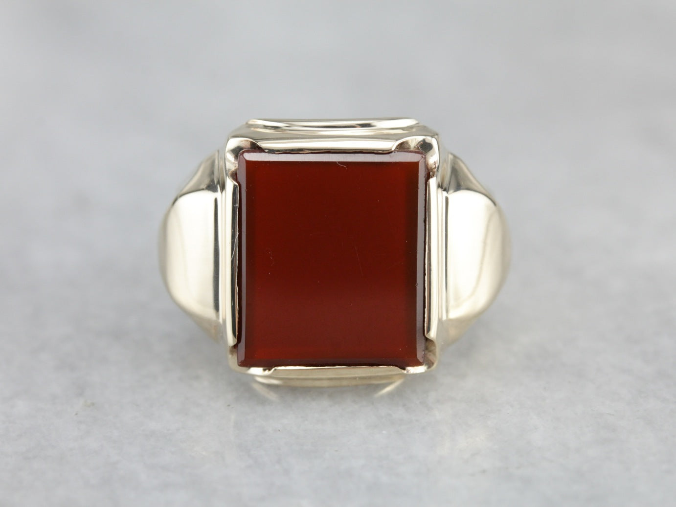 Simple and solid in size, this could be a great vintage piece! Dating to the mid-1900's, and the popular style continues to be a favorite decades later. The center of this ring is set with a deep, brick-red carnelian. Carnelian is traditionally a stone of courage, worn by leaders and heroes.
