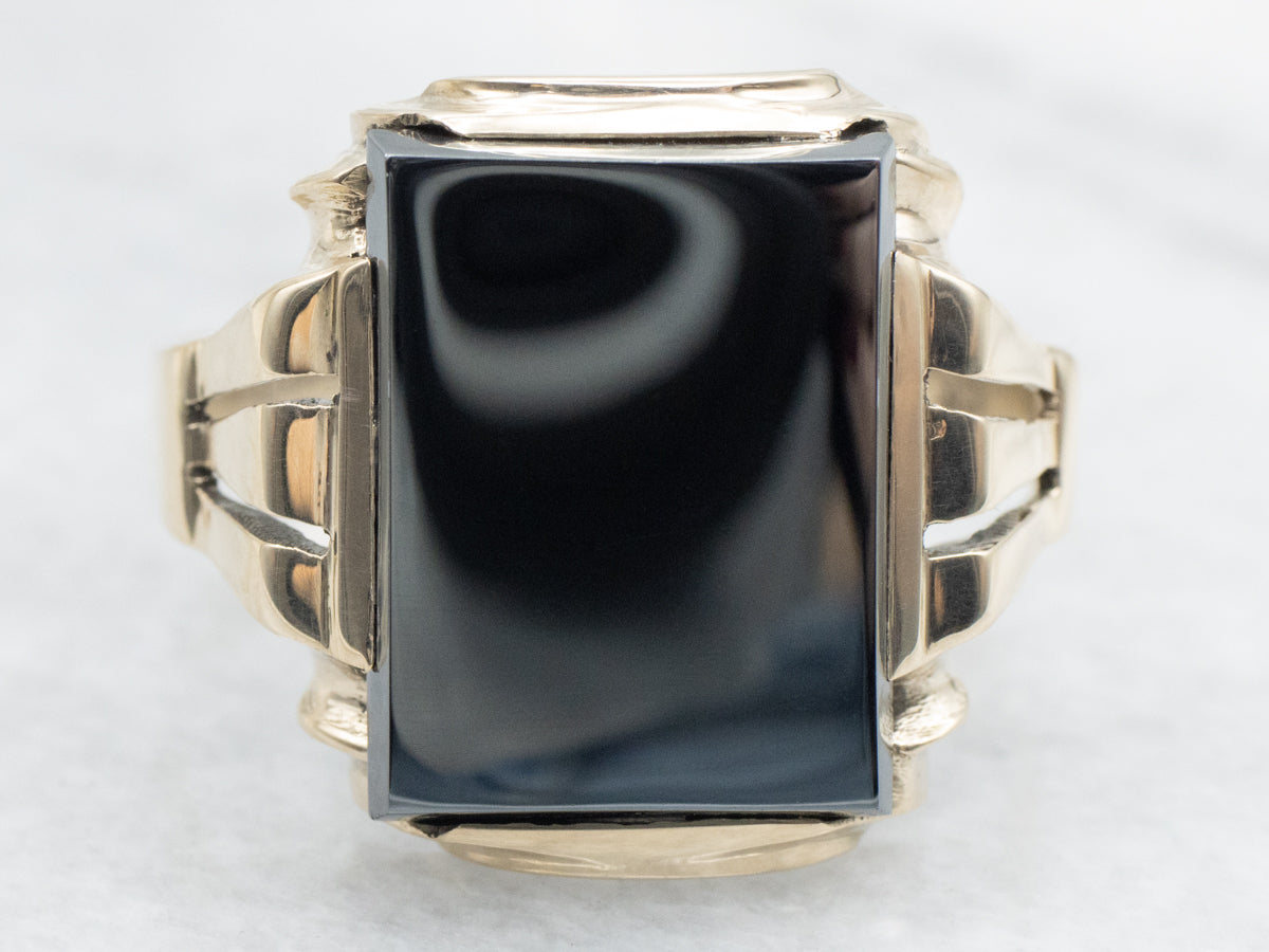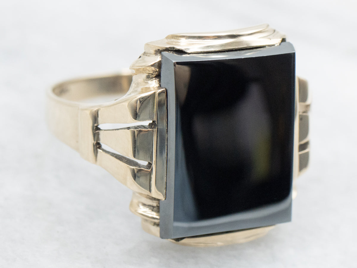 Este anillo vintage tiene un poco de estilo, con una estructura pequeña que lo hace fácil de usar. La piedra central es una hematita facetada, brillante y de color gris intenso, un poco inusual pero aún así sofisticada. El oro es asequible y resistente de 10 quilates, con un ligero brillo rosado cobrizo.