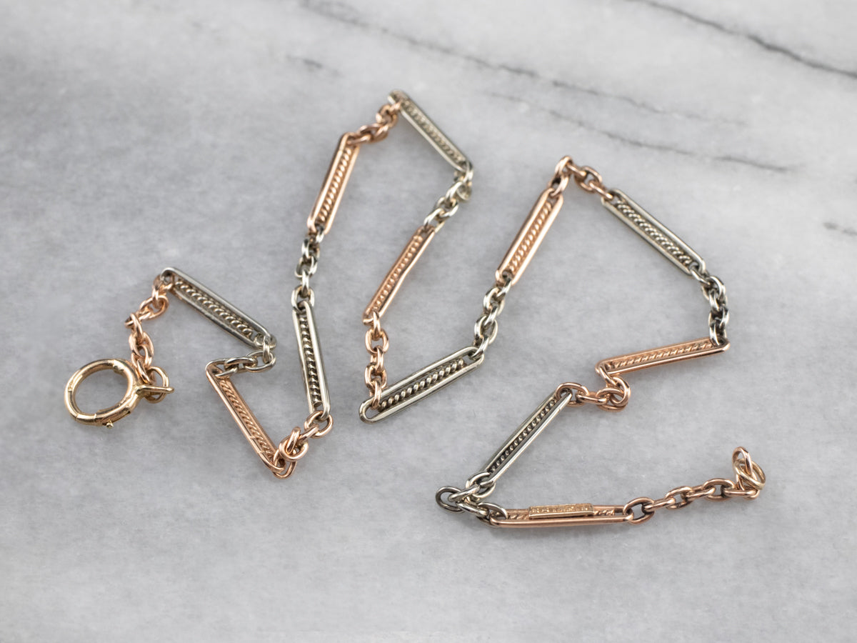 This vintage rose gold pocket watch chain is stunning, an elongated oval link chain with a soft patina. The craftsmanship is superb, creating a strong, well-made chain from which a watch or pendants can easily be hung.