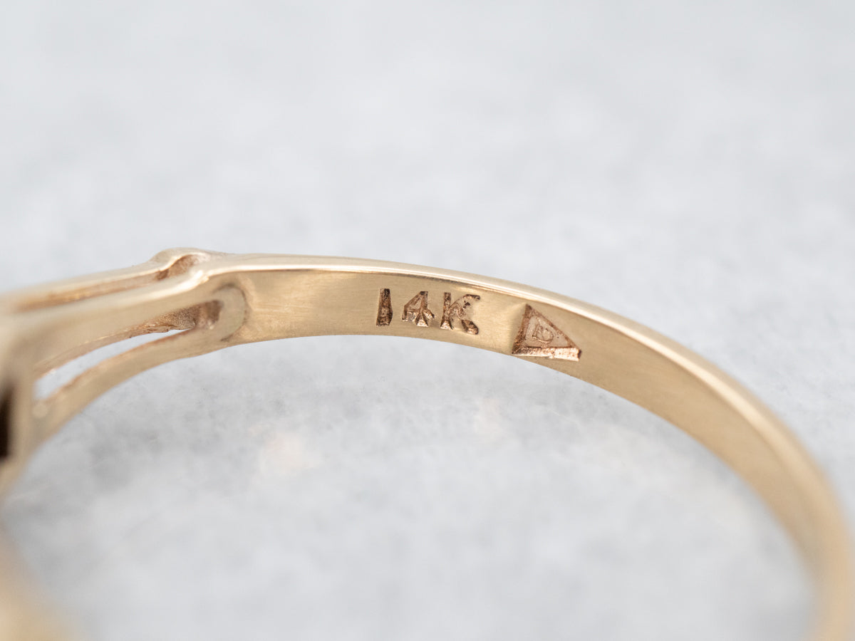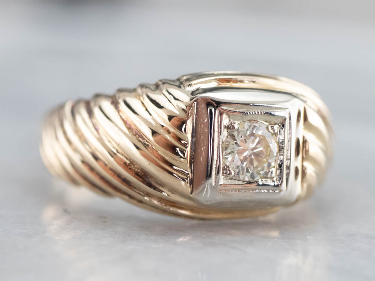 This Retro Era diamond ring is stately and impressive! A trio of bright and sparkling diamonds is set into a white gold frame that lends structure and protection to the stones. A contrasting band of yellow gold adds style and versatility, which along with the ring's low profile makes it easy to wear everyday. This ring would make a nice men's engagement ring!