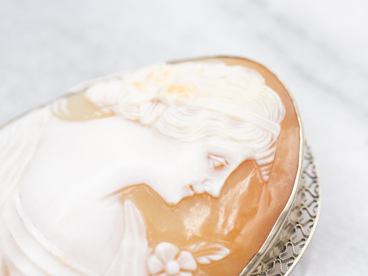 Classic Art Deco, this white gold pin has a romantic flair. The four sides are decorated with traditional bows, giving it a feminine appearance. The shell is intricately carved, with wonderful details in the hair, and well-placed roses that take advantage of the natural orange tint of parts of the shell. This piece can be worn as a pin or a pendant.