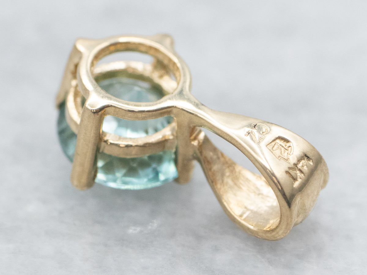 Metal: oro amarillo de 14 quilates. Gema: Circón azul de 2,06 quilates. Medidas de la gema: 6,9 mm, redonda Medidas: 15 x 9 mm, con fianza Marcas: "14KT CZ" estampado en la fianza