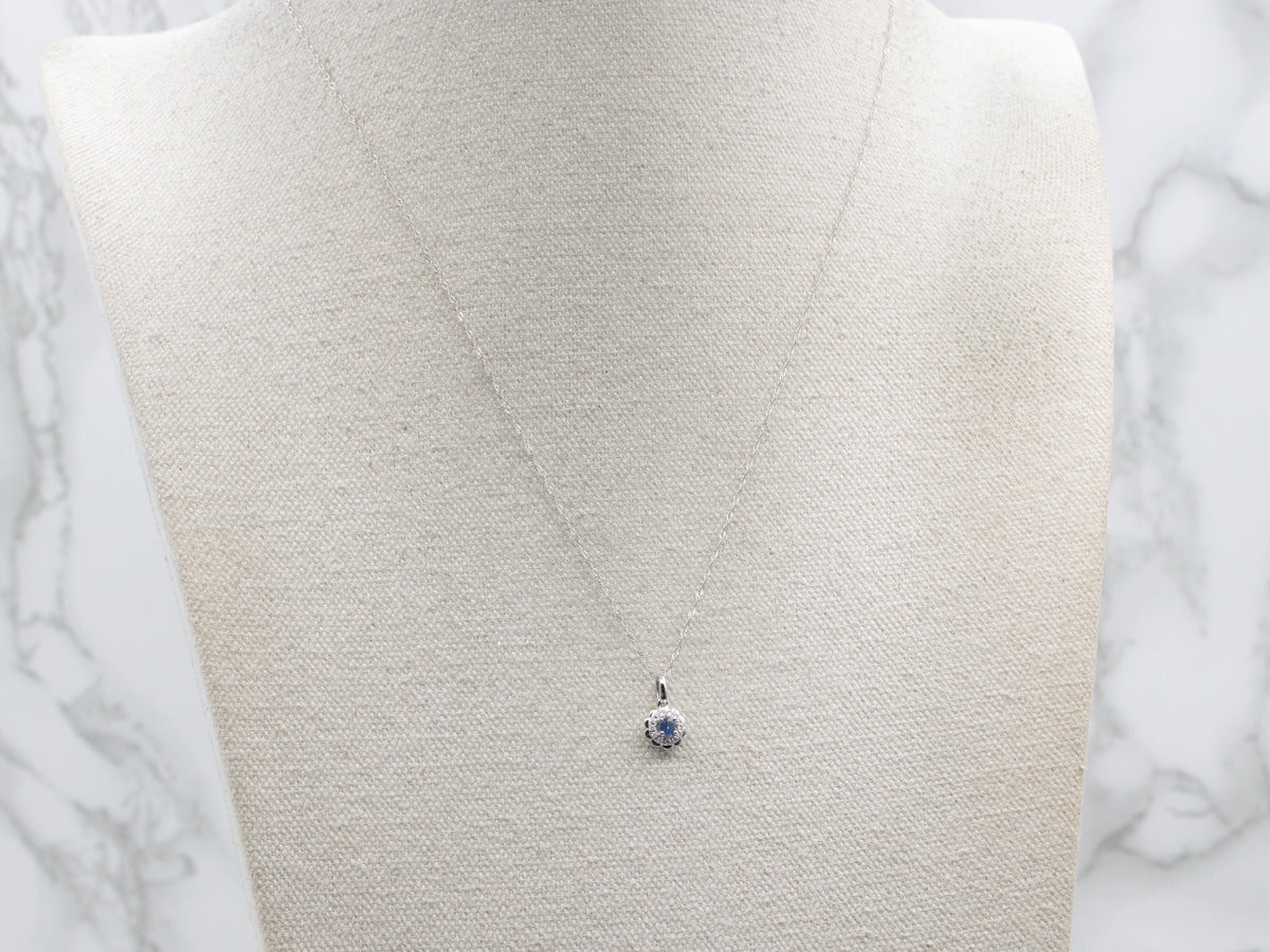 Metal: 14K White Gold Gem: Sapphire .14 Carats Gem Measurements: 2.9 mm, Round Cut Accents: 12 Diamonds totaling .05 Carats, G in Color, SI in Clarity Width of Chain: 0.2 mm Length of Chain: 18 Inches Marks: "14K" Stamped on the clasp