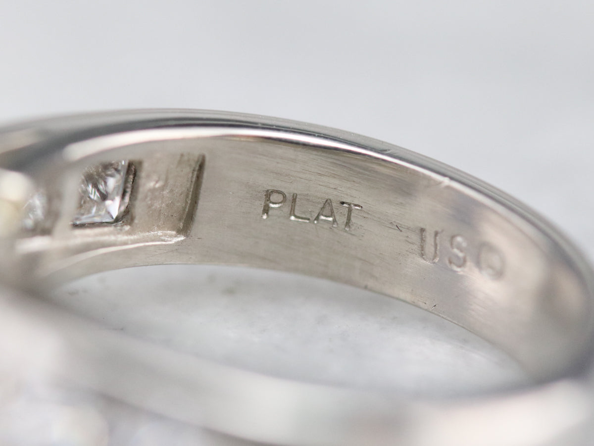 Metal: Platino, Oro blanco de 10 quilates Gema: Zafiro 6,54 quilates Medidas de la gema: 11,6 x 10,0 mm, ovalada Acentos: 6 diamantes con un total de 0,60 quilates, F en color, VVS en claridad Tamaño del anillo: 6 Marcas: "PLAT US@" Estampado en la banda interior