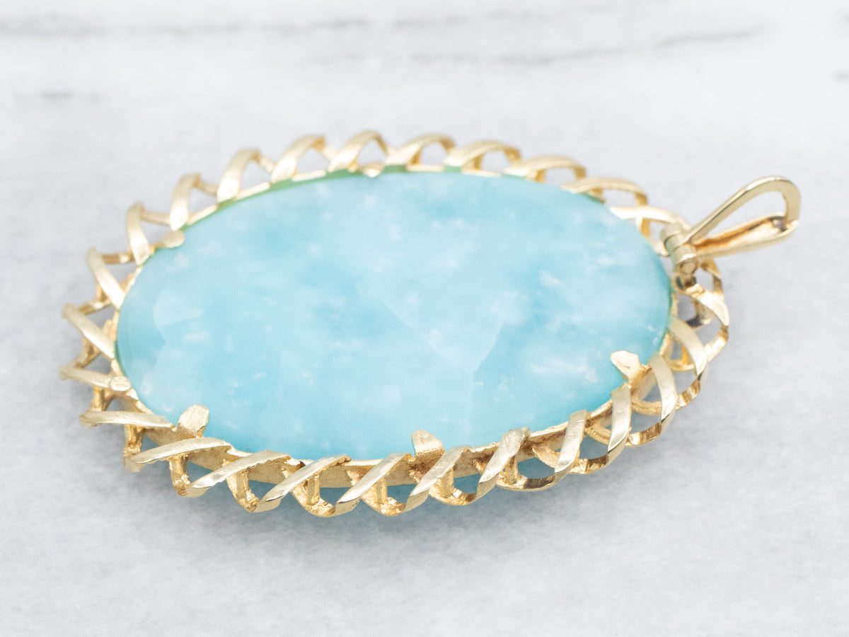 This bold pendant has an enchanting color! The golden sheen obsidian is both ethereal and haunting! A twisting yellow gold bezel-set mounting holds the stone securely, this is quite the statement piece!