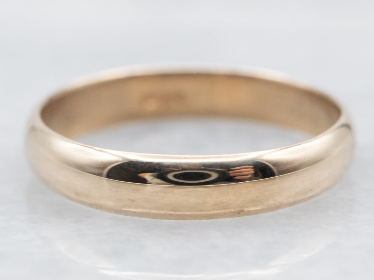 This vintage unisex wedding band is crafted from 14 karat gold and has a beautiful warmth to it! The rounded design feels comfortable on the finger, while the simplicity of style makes this ring timeless for years to come.